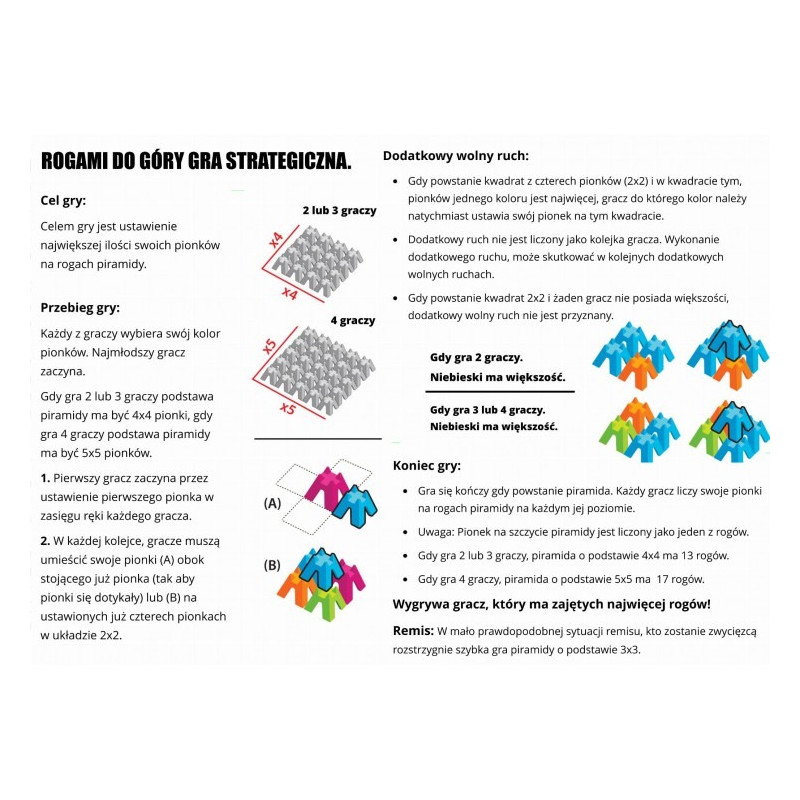 Gdy gra 2 lub 3 graczy podstawa piramidy ma być 4x4 pionki, gdy gra 4 graczy podstawa piramidy ma być 5x5 pionków.