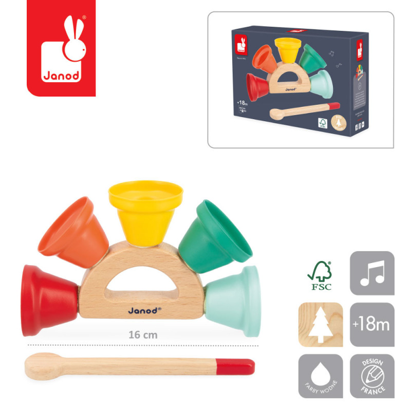 Dzwoneczki to idealna pierwsza zabawka muzyczna dla dziecka, która pomaga rozwijać słuch, poczucie rytmu oraz zdolności muzyczne. Wspiera także rozwój wyobraźni, koncentracji, wytrwałości i koordynacji ruchowej. Zabawka posiada 5 kolorowych metalowych dzwoneczków na drewnianym uchwycie, którymi można potrząsać lub uderzać w nie dołączoną drewnianą pałeczką.
