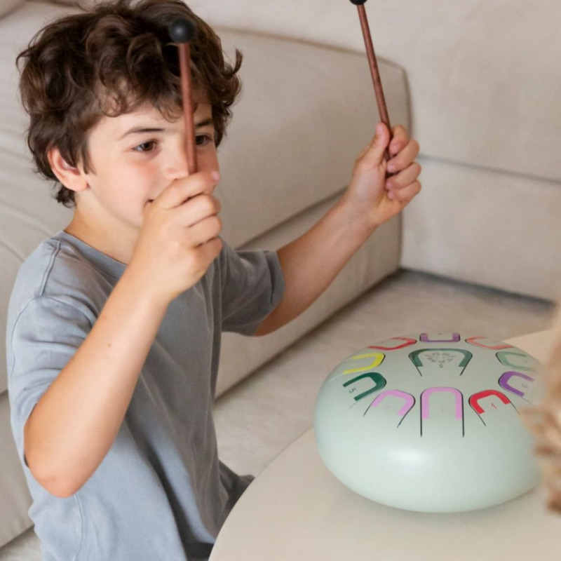 Dzięki 11 dźwiękom w skali durowej (F-dur), TAMBÚ+ pozwala na tworzenie prostych melodii już od pierwszych prób. Można na nim grać pałeczkami, dłońmi lub eksperymentować z różnymi technikami. Do zestawu dołączono kolorowe i numerowane nuty, które ułatwiają naukę nawet najmłodszym muzykom.