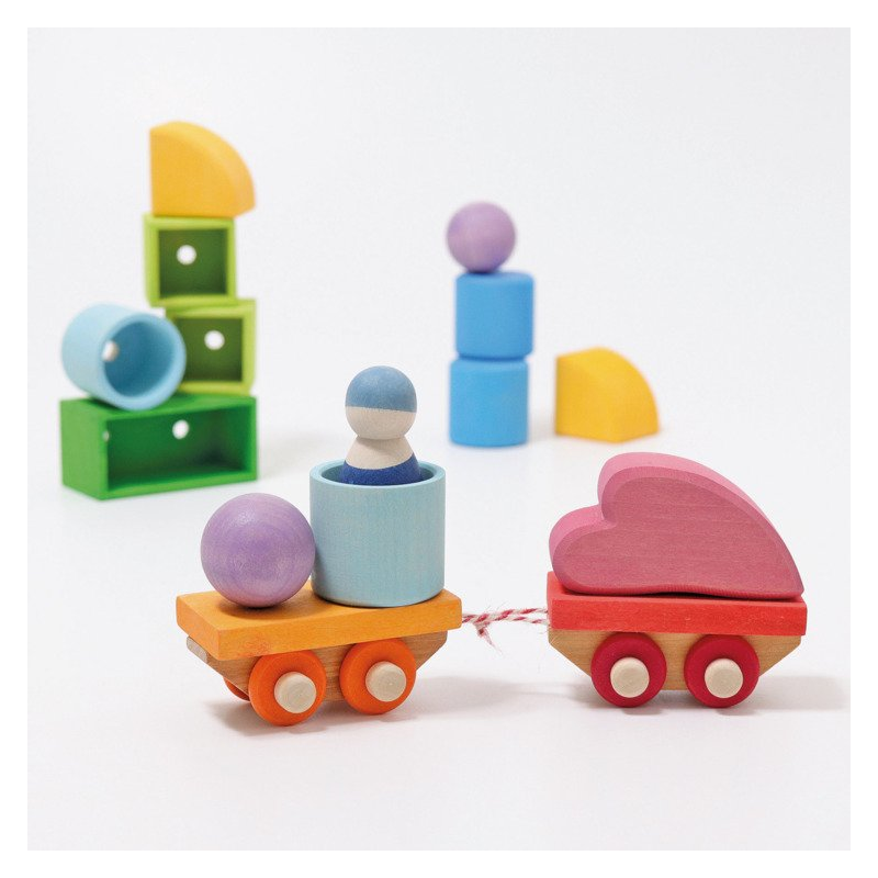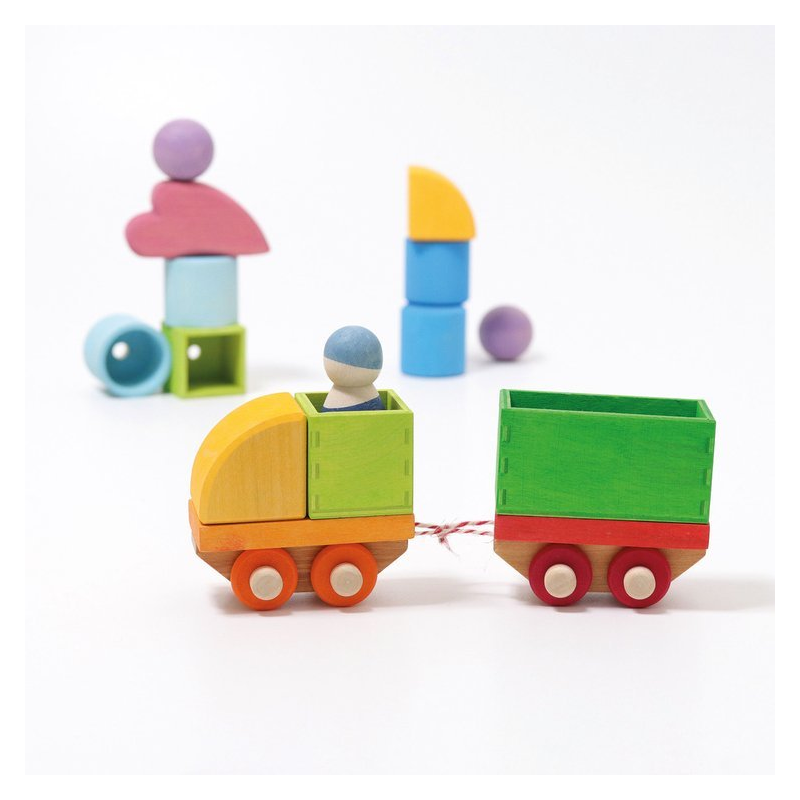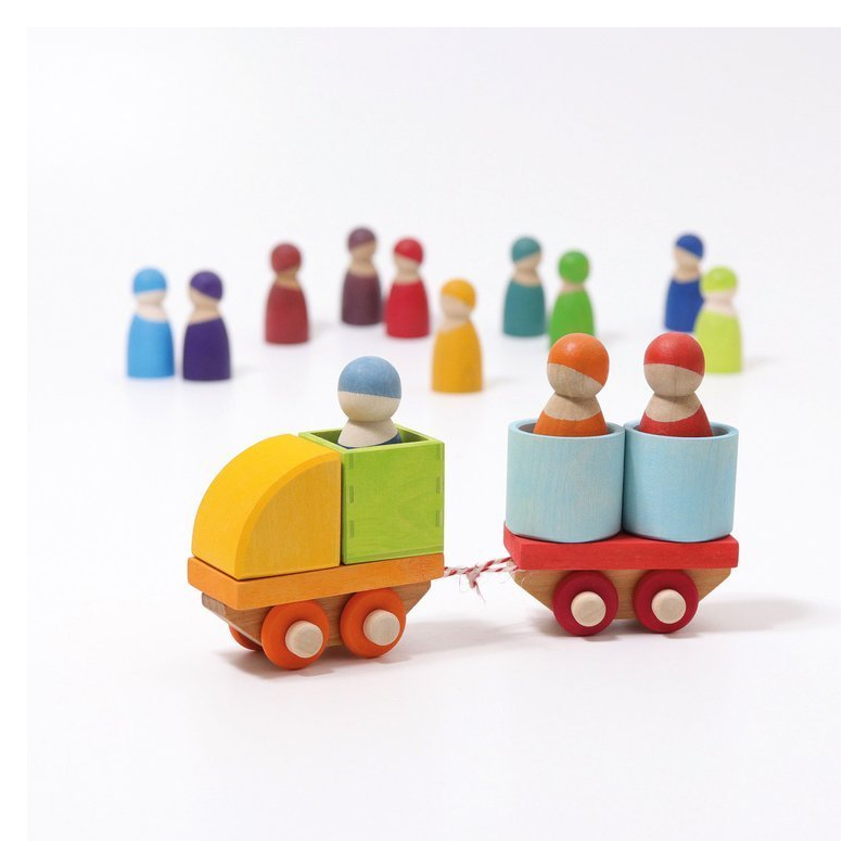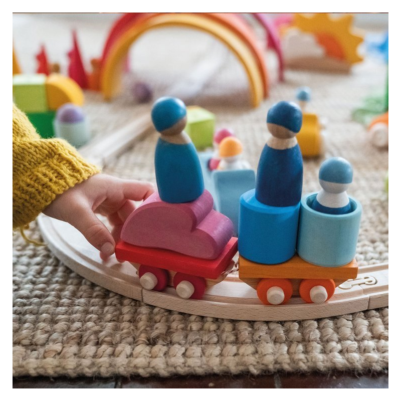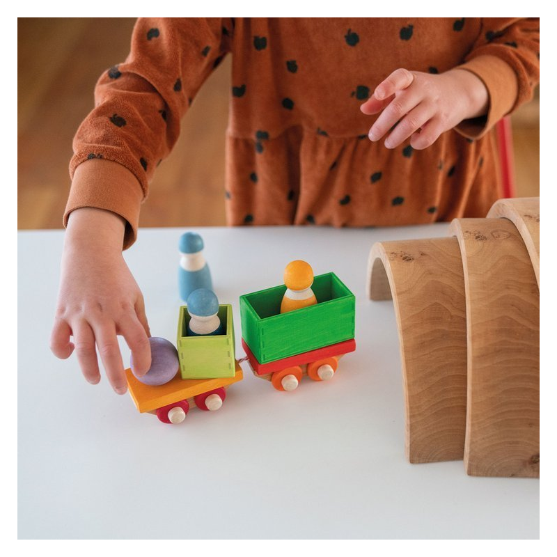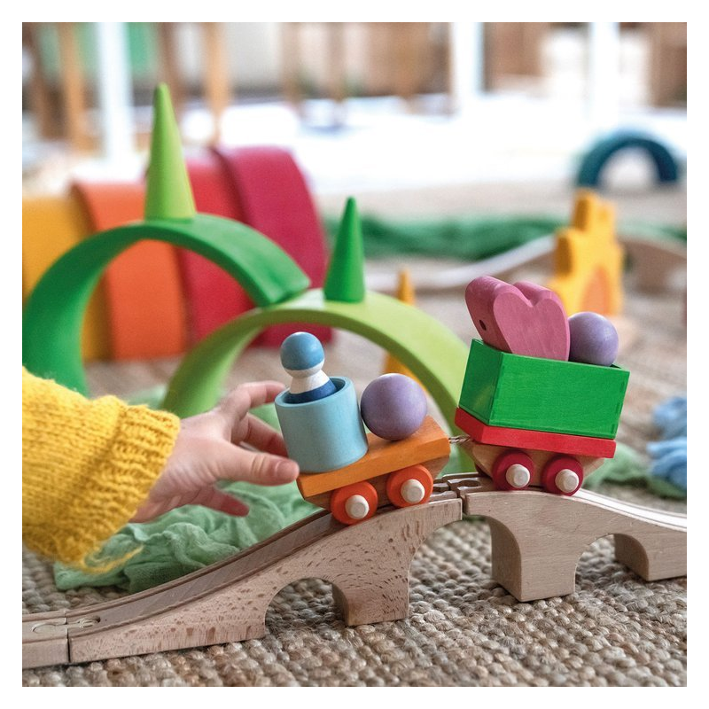 Zestaw tęczowych drewnianych elementów z wagonikami
