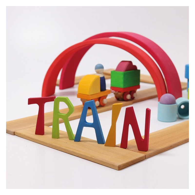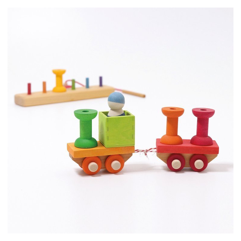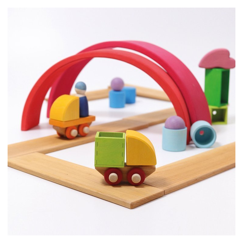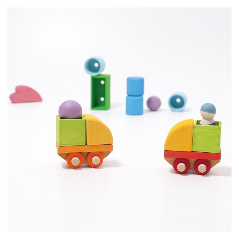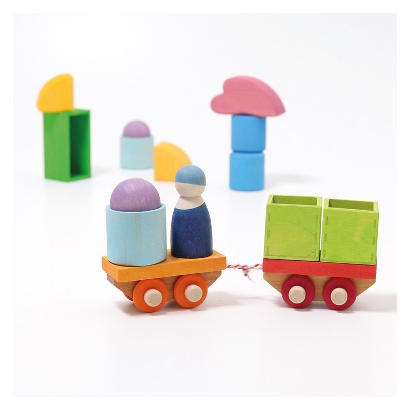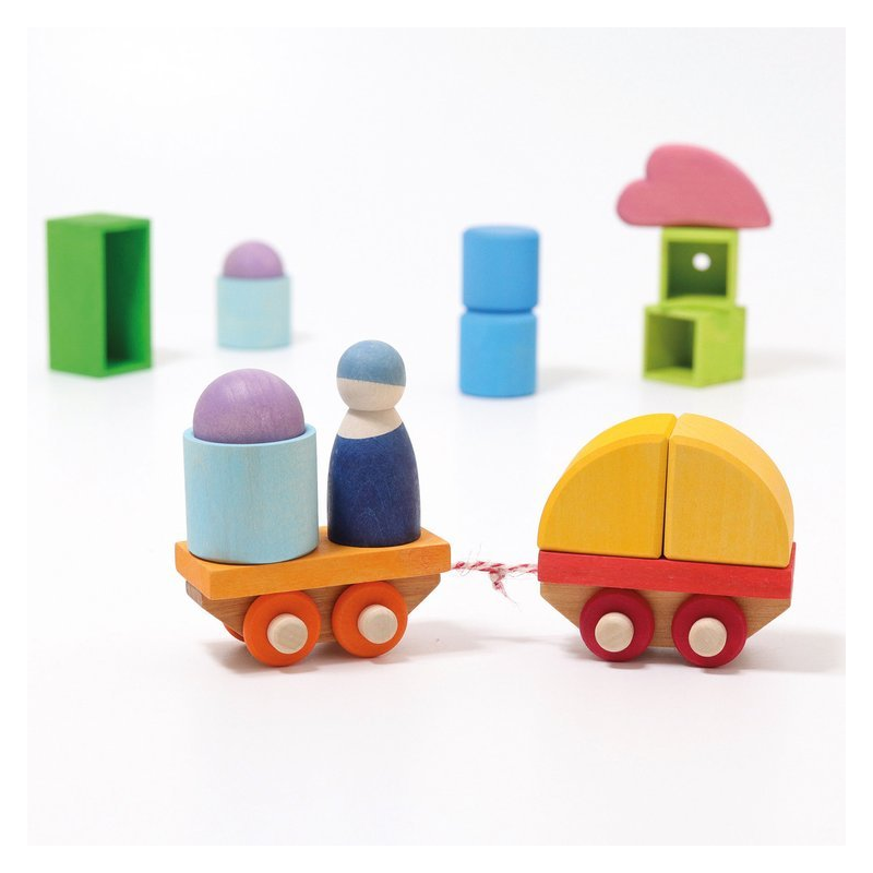 Zestaw tęczowych drewnianych elementów z wagonikami