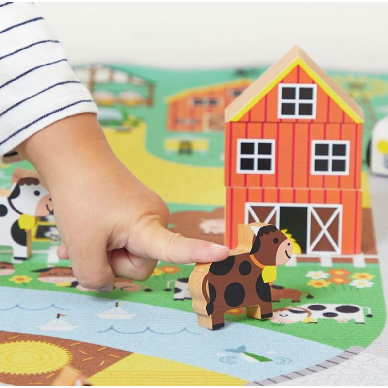 Zestaw klocków i figurek z serii Cross Roads marki JANOD to doskonałe uzupełnienie maty-dywanu do zabawy z drogą Wieś z tej samej kolekcji. Klocki wykonane są z drewna, posiadają poręczne kształty dopasowane do małych rączek i piękne kolory. Zachęcają malucha do snucia własnych historii i kreatywnej zabawy.