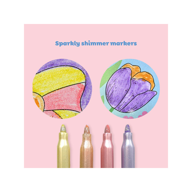 - 36 stron do kolorowania, 4 błyszczące flamastry