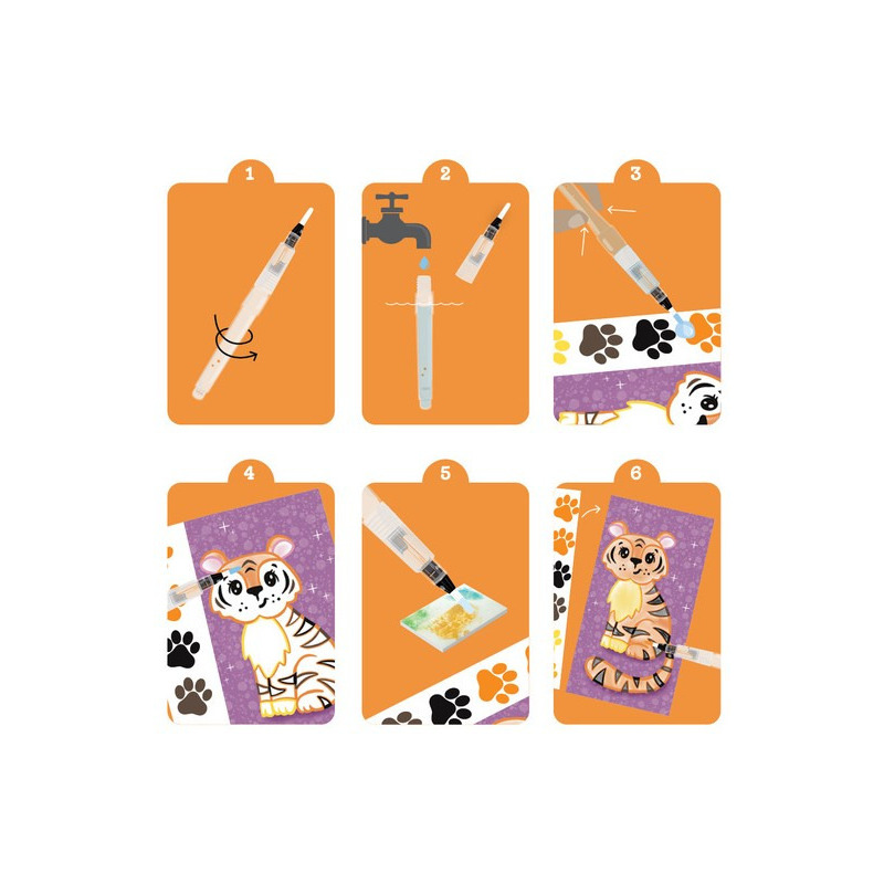 - Pędzelek wodny – bezpieczny pędzelek, który wystarczy zanurzyć w wodzie, aby rozpocząć malowanie, bez konieczności używania farb.