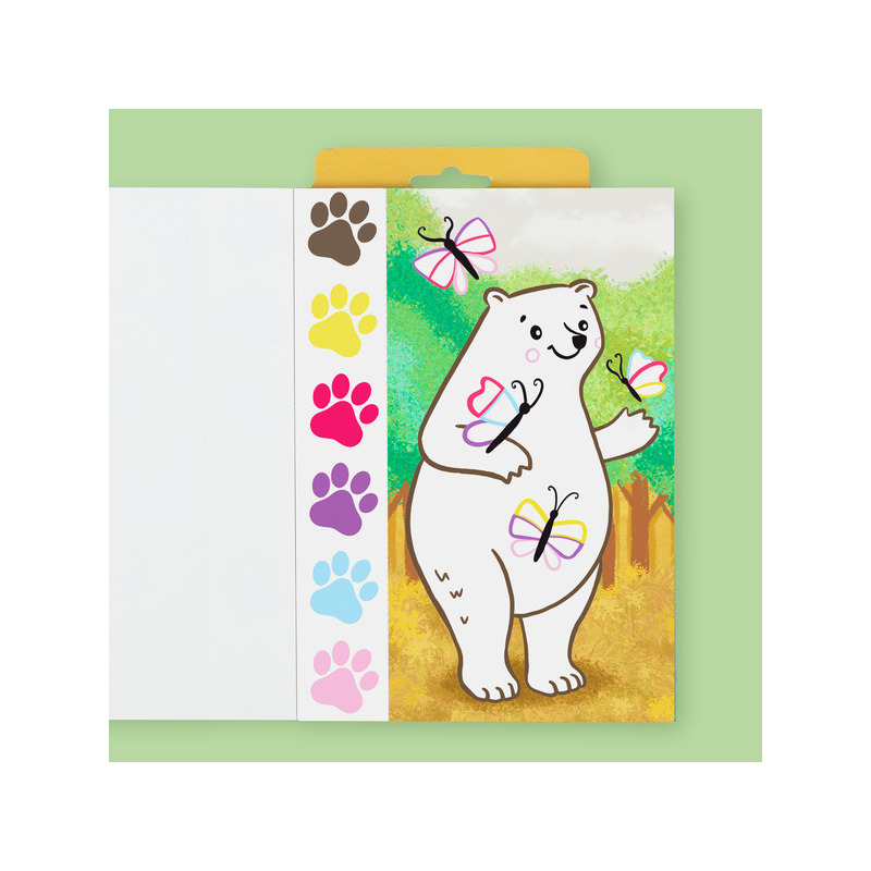 - 6 pigmentów na każdej stronie – każda strona zawiera zestaw pigmentów, które aktywują się po nałożeniu wody, tworząc żywe kolory.