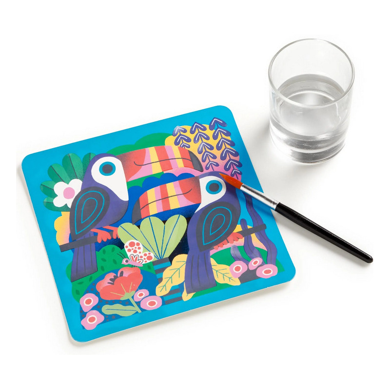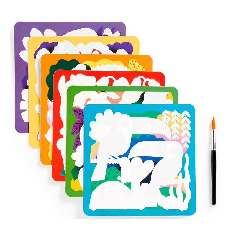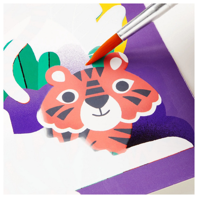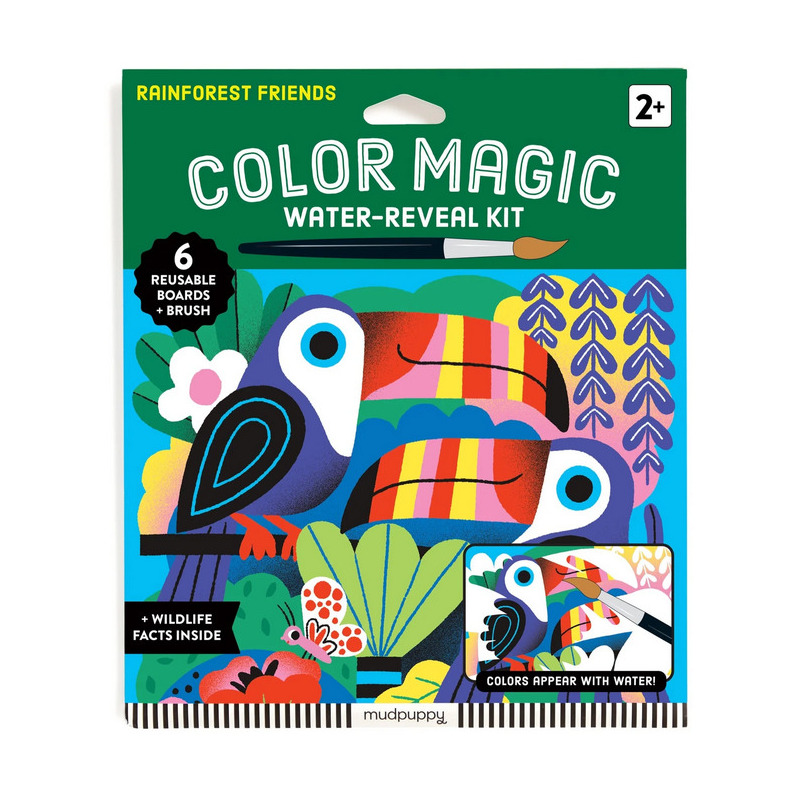 Zestaw kreatywny Kolorowanka wodna Las deszczowy marki MUDPUPPY to świetna angażująca, rozwijająca i uspokajająca zabawka dla maluchów. W zestawie znajduje się 6 plansz z ilustracjami przedstawiającymi egzotyczne stworzenia, m.in. tukana, kameleona czy tygrysa oraz pędzelek. Co więcej, w zestawie znajdziemy ciekawostki o nich! Po uprzednim namoczeniu pędzelka w wodzie i przyłożeniu go do obrazka, na ilustracji „magicznie” pojawiają się kolory. Znikają one chwilę po wyschnięciu, dzięki czemu obrazki można kolorować wielokrotnie. Zabawka zachwyca, zaskakuje i rozbudza wyobraźnię.