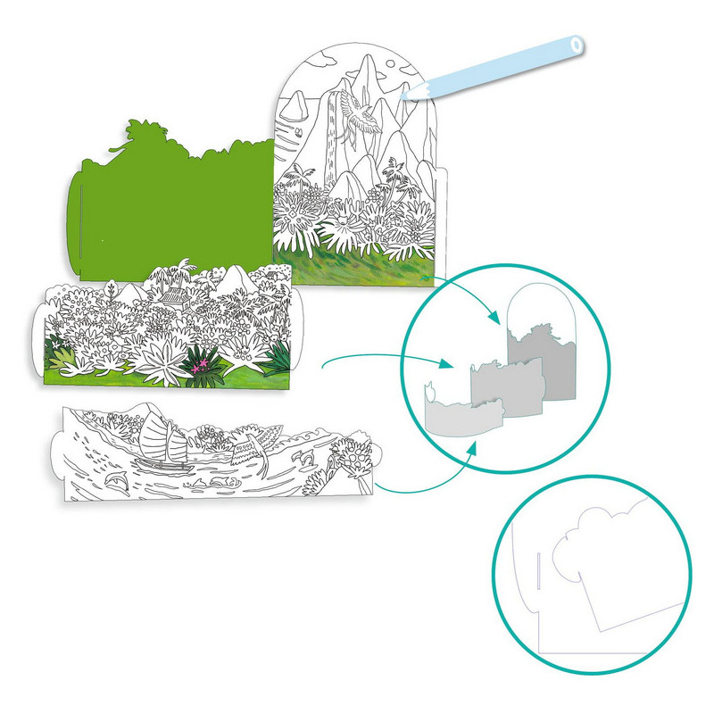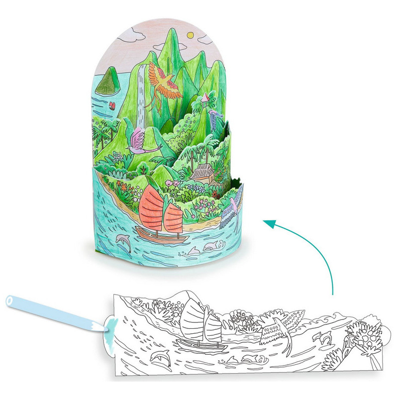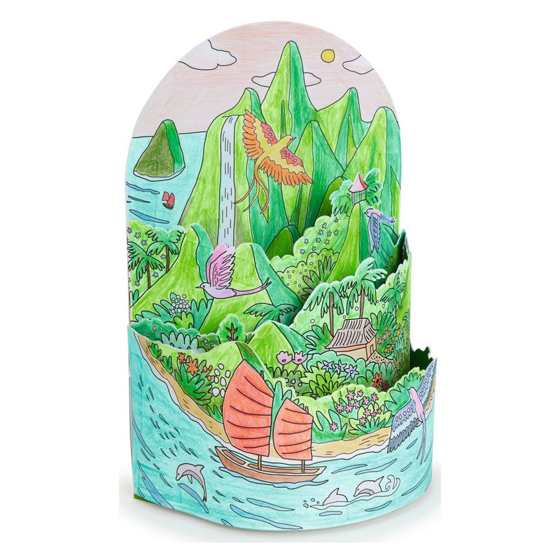 "Na szczycie mojej wyspy" to niezwykłe kolorowanki w formie 3D, które zamieniają się w ozdobną figurę, imitującą górzystą wyspę, otoczoną malowniczym oceanem. Zadanie polega na pokolorowaniu i złożeniu poszczególnych części w całość, którą można postawić jako ozdobę.