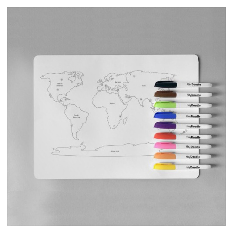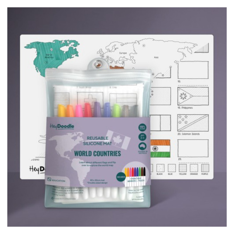 MAPA ŚWIATA duża dwustronna silikonowa mata do kolorowania A3 z 9 pisakami zmazywalnymi HeyDoodle 3+
