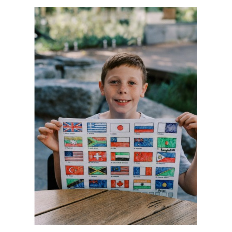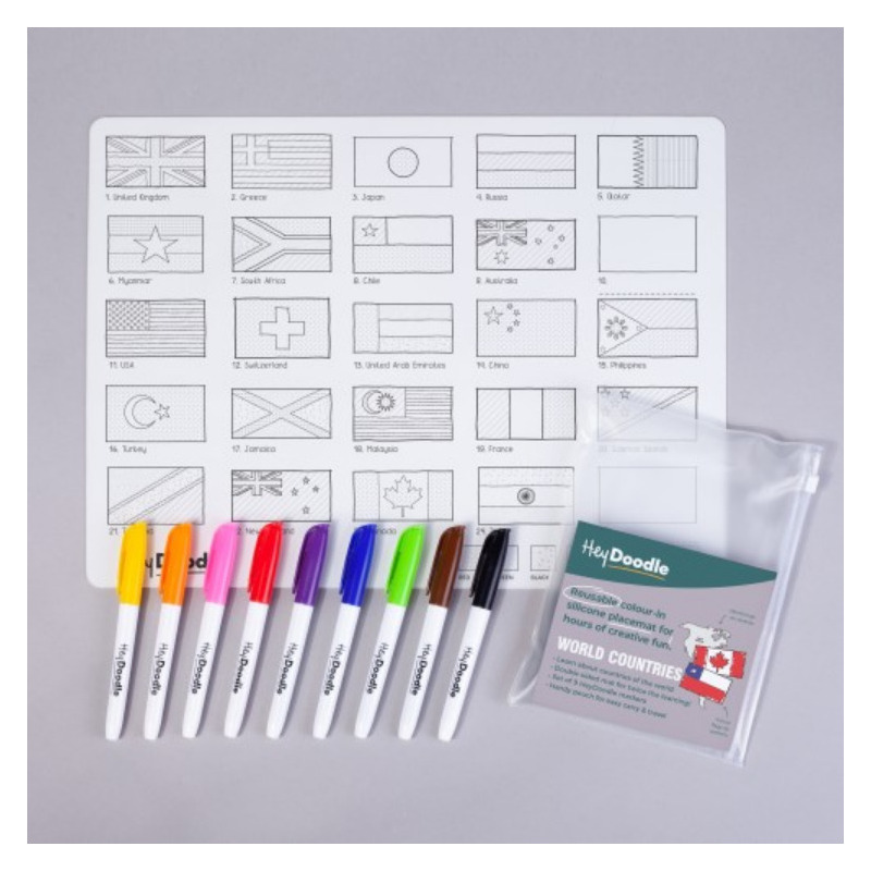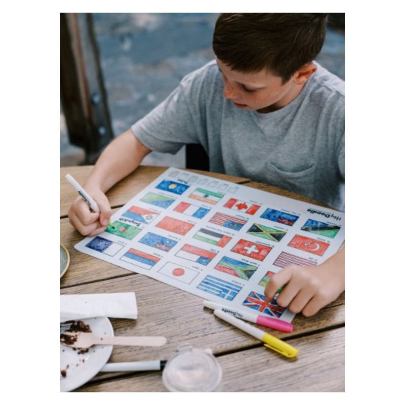 Dwustronne kolorowanie bez końca! Koloruj i ucz się, poznaj flagi świata i pokoloruj je zgodnie ze wzorami z legendy, a potem odwróć matę, aby kolorować i uczyć się na mapie świata. Jedyna dwustronna silikonowa mata A3. Odkrywaj kontynenty i flagi wybranych państw, zaprojektuj własną flagę wykorzystując elementy innych flag lub stwórz zupełnie nową. Po zabawie matę można wyczyścić i użyć ponownie, ponownie i ponownie kolorując, pisząc i ucząc się!