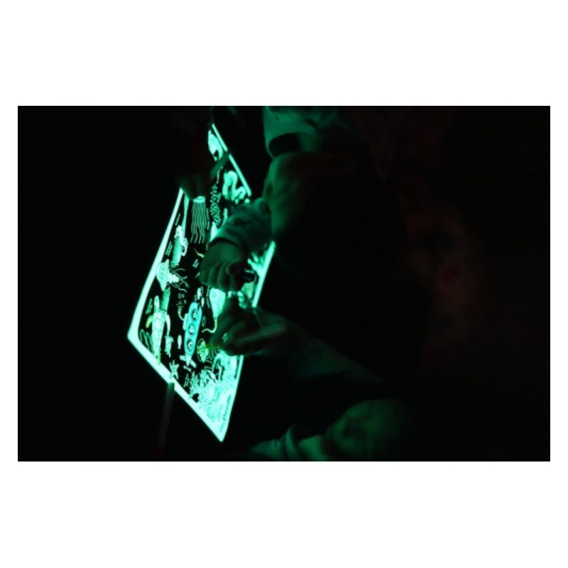 Koloruj i rysuj, a przy okazji daj się ponieść podwodnej przygodzie. Zanurz się w głębiny łodzią podwodną i odkryj świecący podwodny świat - niezwykłe ryby, ośmiornica, meduza, rafa koralowa i wiele innych niezwykłych stworzeń. Silikonowa mata A4 ma do kolorowania bioluminescencyjne stworzenia żyjące w głębinach oceanów. Zgaś światło i zobacz jak świecą w ciemności. Po zabawie matę można wyczyścić i użyć ponownie, ponownie i ponownie kolorując i ucząc się!