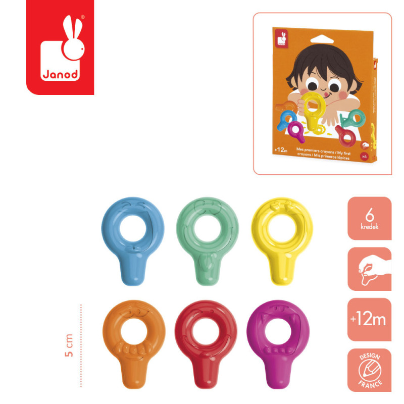 Zestaw 6 kredek woskowych marki JANOD w pięknych, intensywnych kolorach. Są krótkie z poręcznymi okrągłymi uchwytami, które również kolorują. Kształt kredek jest łatwy do uchwycenia przez małe dłonie. Przeznaczone do pierwszych prób rysowania.