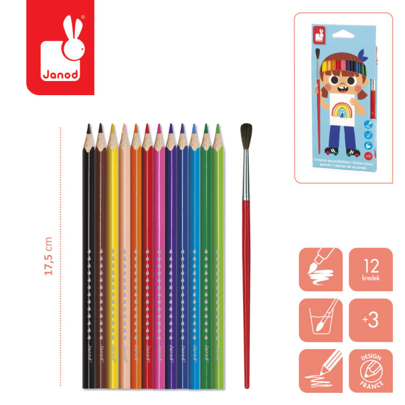 Kredki akwarelowe z pędzelkiem 12 kolorów COLO Janod 3+
