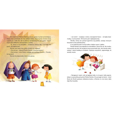W przedszkolu Dusia poznaje Monikę, która gryzie, Joasię, która boi się ubrudzić, i Tomka,