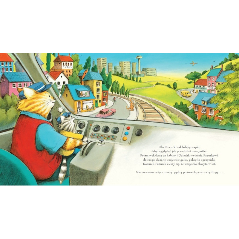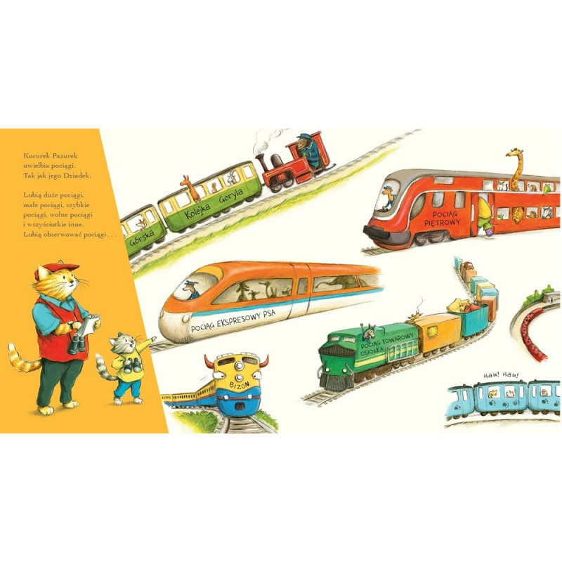 Uwaga! Uwaga! Ciuch-ciuch! Kocurek Pazurek i jego Dziadek uwielbiają pociągi: podróżować nimi i je obserwować.