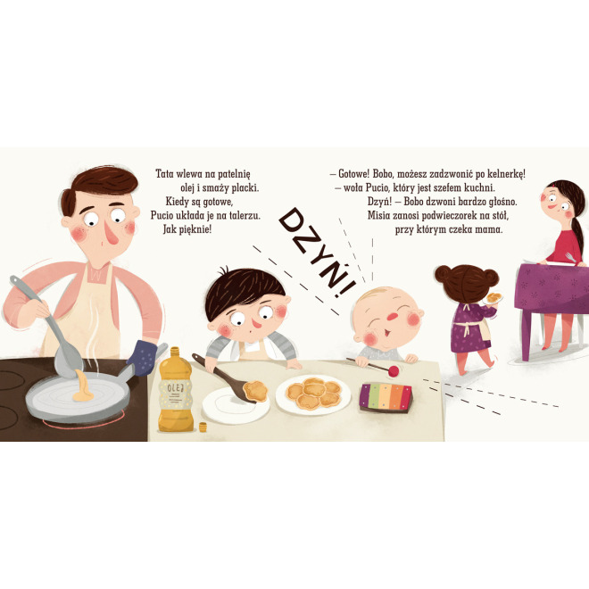 tata kroi owoce, Pucio miesza, a Misia dosypuje do miski kolejne składniki. I podwieczorek zaraz gotowy!