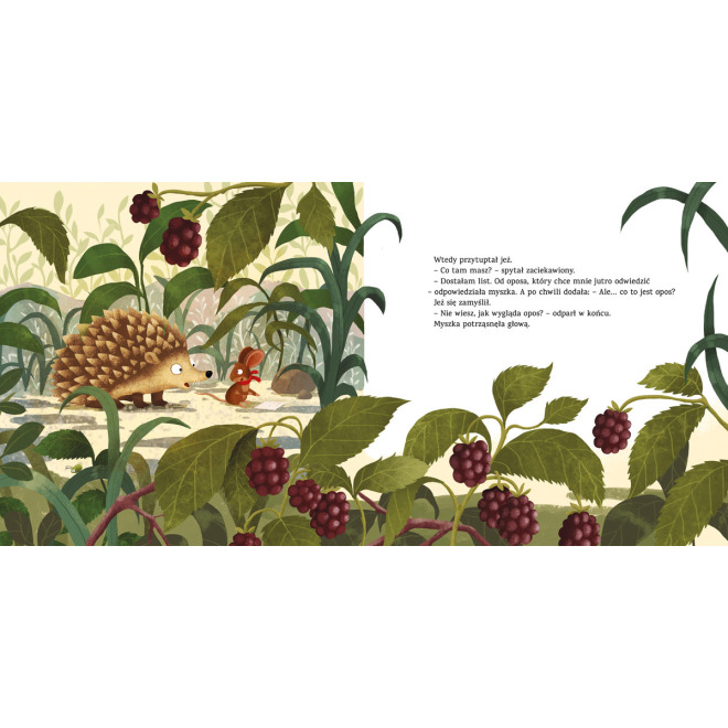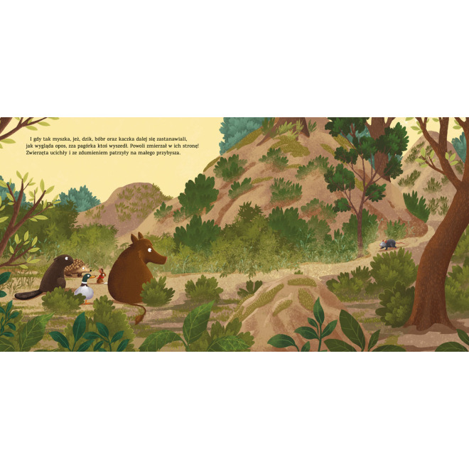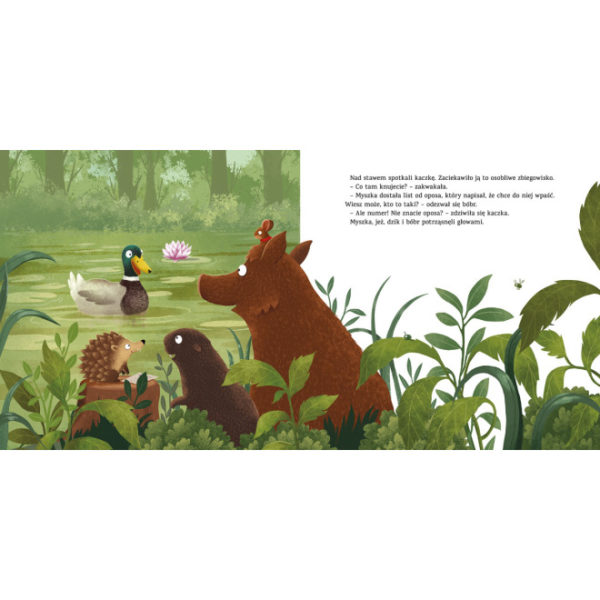 Myszka dostała list. Od oposa, który chce ją odwiedzić! Ale jak wygląda opos? Każde zwierzę wyobraża go sobie inaczej. Jeż twierdzi, że to olbrzymi stwór z kartoflowatym nosem. Kaczka jest pewna, że opos mieszka na dnie stawu i jada końską kupę. Tymczasem bóbr uważa, że oposy fruwają… W dodatku do tyłu!