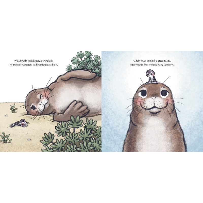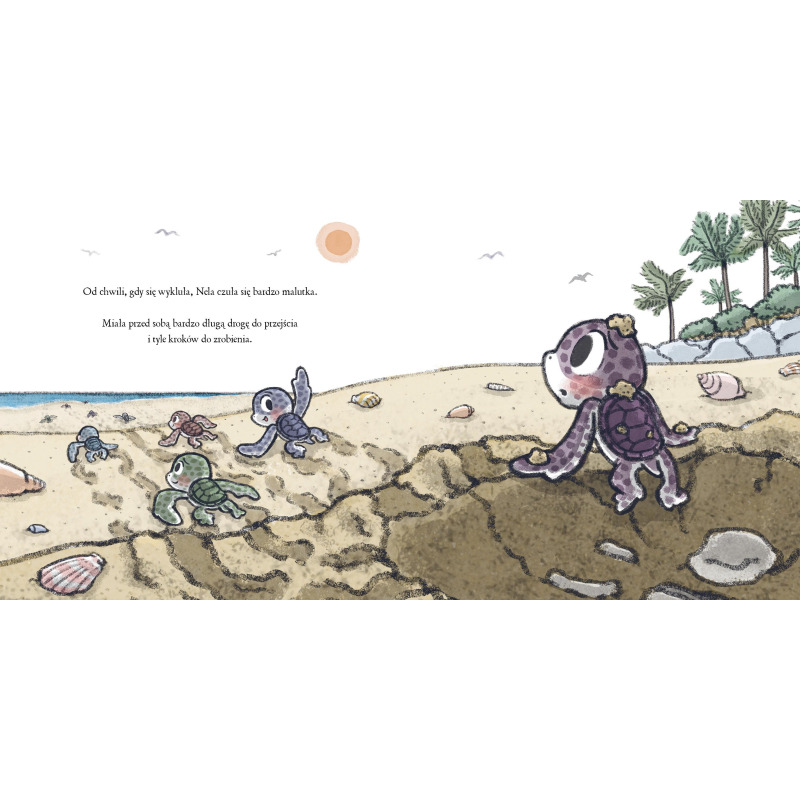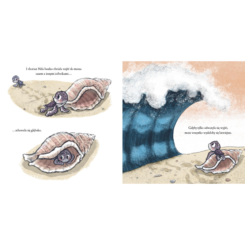 Nela, mała żółwica, dopiero co przyszła na świat. Jej bracia i siostry ruszyli już w stronę oceanu, ale ona została na plaży – przerażona głośnymi falami i ogromem nieznanego. Kiedy zapada noc, a piasek robi się zimny, Nela uświadamia sobie, że za falami jest coś więcej – cały świat do odkrycia.