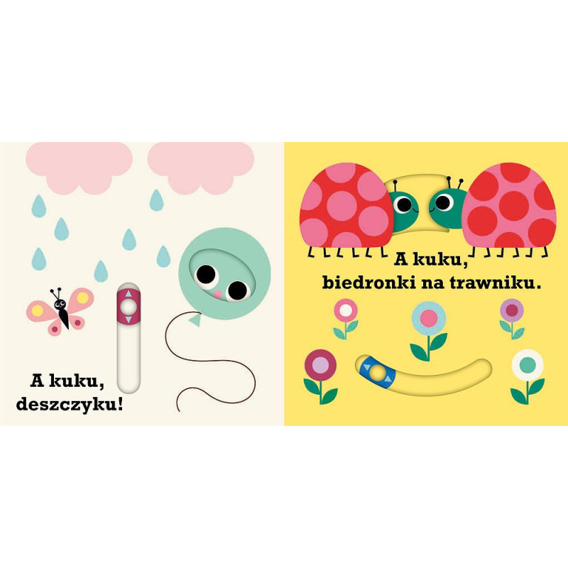 Popularna zabawa w „A kuku!” została przeniesiona na kartki książki, która na pewno spodoba się maluszkom. Wyraźne, kolorowe ilustracje, ruchome elementy i lusterko gwarantują początek wspaniałej przygody z książką.