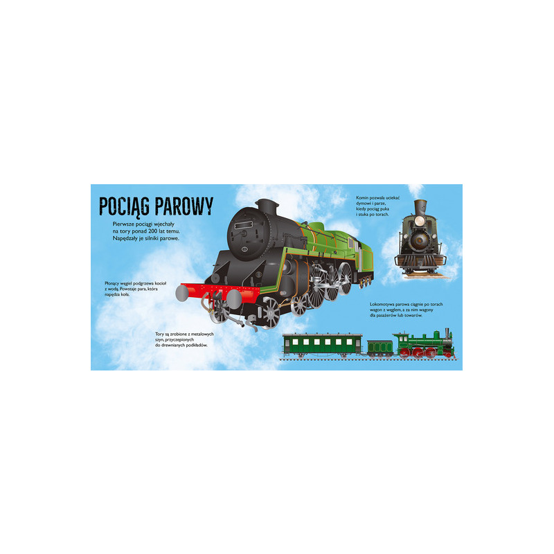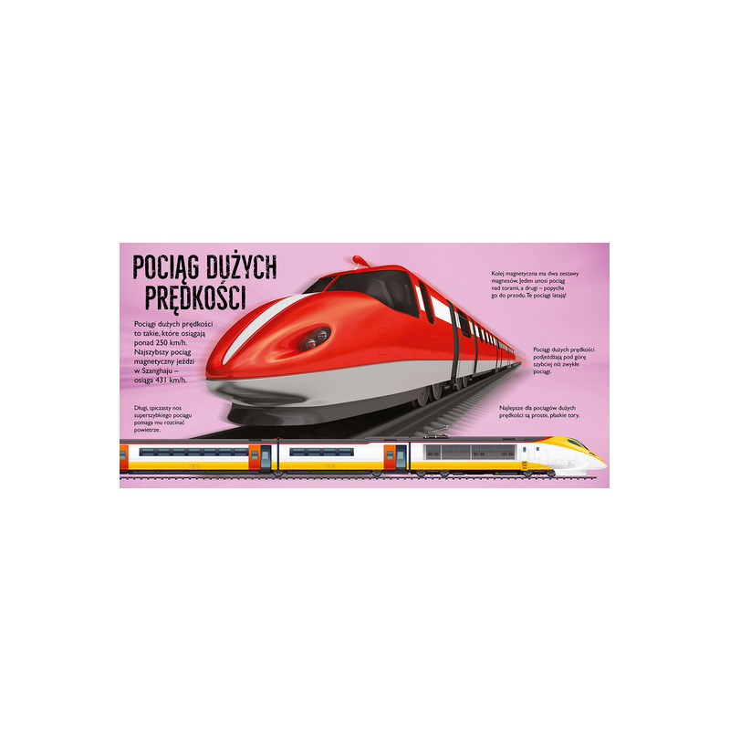 Dokąd jedzie Orient Express? Czym jest pantograf, a czym kolej magnetyczna? Z jaką prędkością może jechać pociąg? W tej książce znajdziesz odpowiedzi na te i wiele innych pytań Książka z serii POP-UP 10 czytelnicy zawiera 10 przestrzennych ilustracji, które przedstawiają różnorodne pociągi sprzed wielu lat, a także najbardziej zaawansowane technologicznie maszyny. Bogactwo interesujących informacji pomoże pogłębić wiedzę o tych pojazdach, zapewni inspirującą lekturę i doskonałą zabawę.
