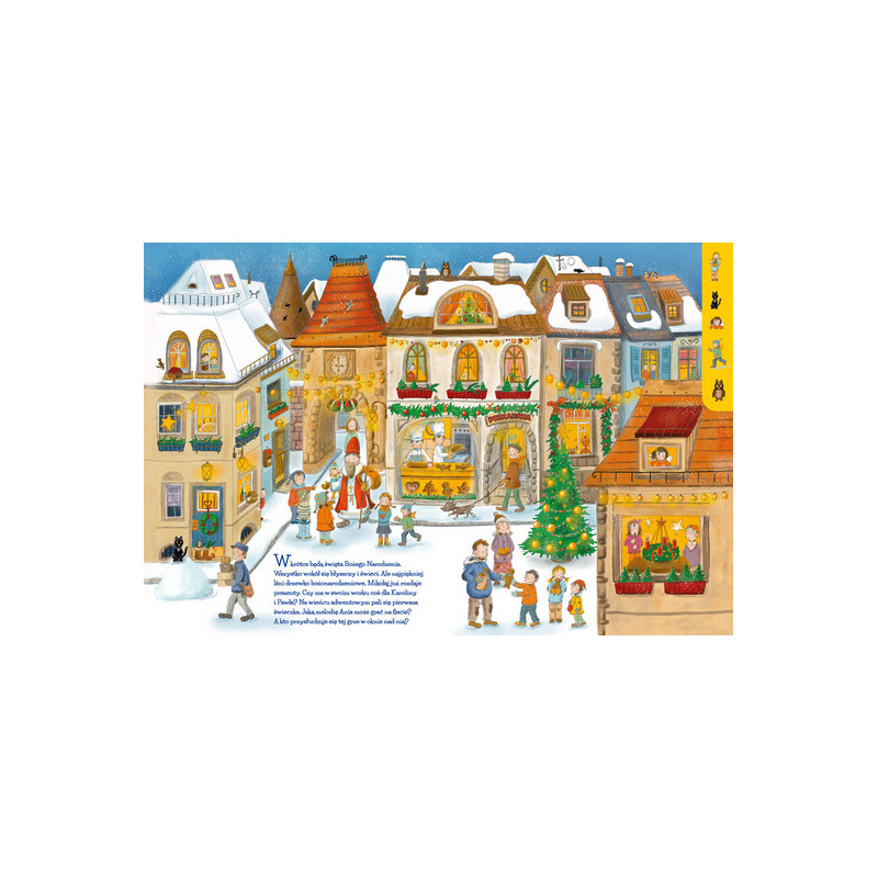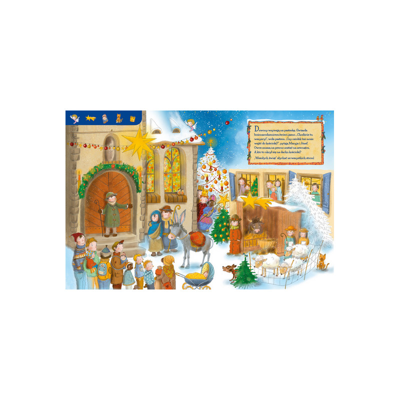 Dzieci uwielbiają czas Adwentu i Bożego Narodzenia, gdy wokół panuje nastrój oczekiwania i możemy cieszyć się świątecznymi zwyczajami. Ta kartonowa książka z dużymi, kolorowymi obrazkami, na których ukryte są rozmaite szczegóły, zaprasza do odwiedzenia przedświątecznego jarmarku, obejrzenia jasełek i wybrania się do kościoła na bożonarodzeniową mszę. Na każdej stronie znajdziemy krótki tekst i małe elementy do wyszukania na pełnej detali dużej ilustracji. Wśród nich ukrywają się również bożonarodzeniowe aniołki! Liczne szczegóły zachęcają dzieci do wspólnej rozmowy o ich ulubionych tradycjach i nastroju oczekiwania na święta. Zdobiona czerwoną folią metaliczną okładka zachęca, by zajrzeć do środka książki i odkrywać kolejne strony.