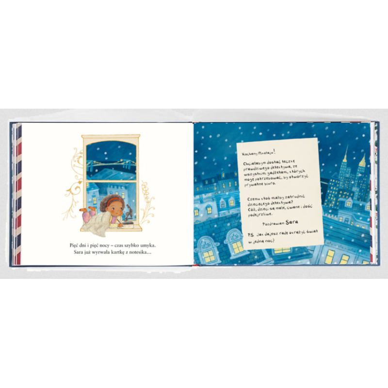 Pięcioro dzieci z całego świata pisze do Świętego Mikołaja z pomysłami na prezenty świąteczne i z zaskoczeniem odkrywa, że on im odpowiada! Odkryj pięć listów od Świętego, które dzieci mogą wyciągnąć i przeczytać, a każdy z nich jest opatrzony planem prezentu wykonanego przez elfy w warsztacie Mikołaja. W każdym liście poznajesz ukryty świat Bieguna Północnego – od tego, jak renifery potrafią spać na stojąco, po ulubione przekąski Mikołaja zostawiane w Wigilię oraz sposób, w jaki pokonuje świat w tak krótkim czasie. Ale czy prezenty, o które proszą dzieci, zdążą powstać na czas?