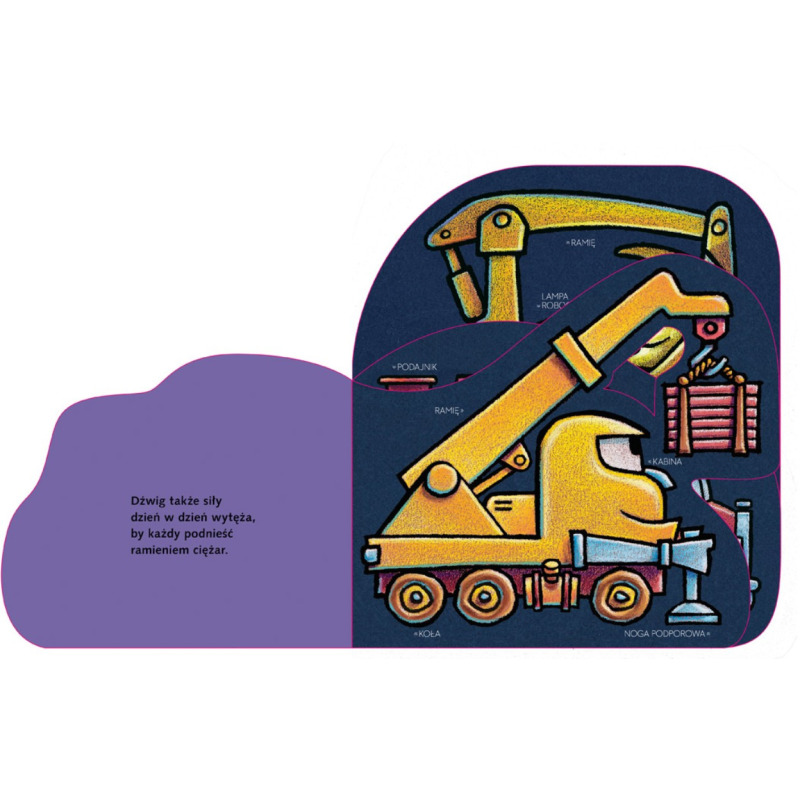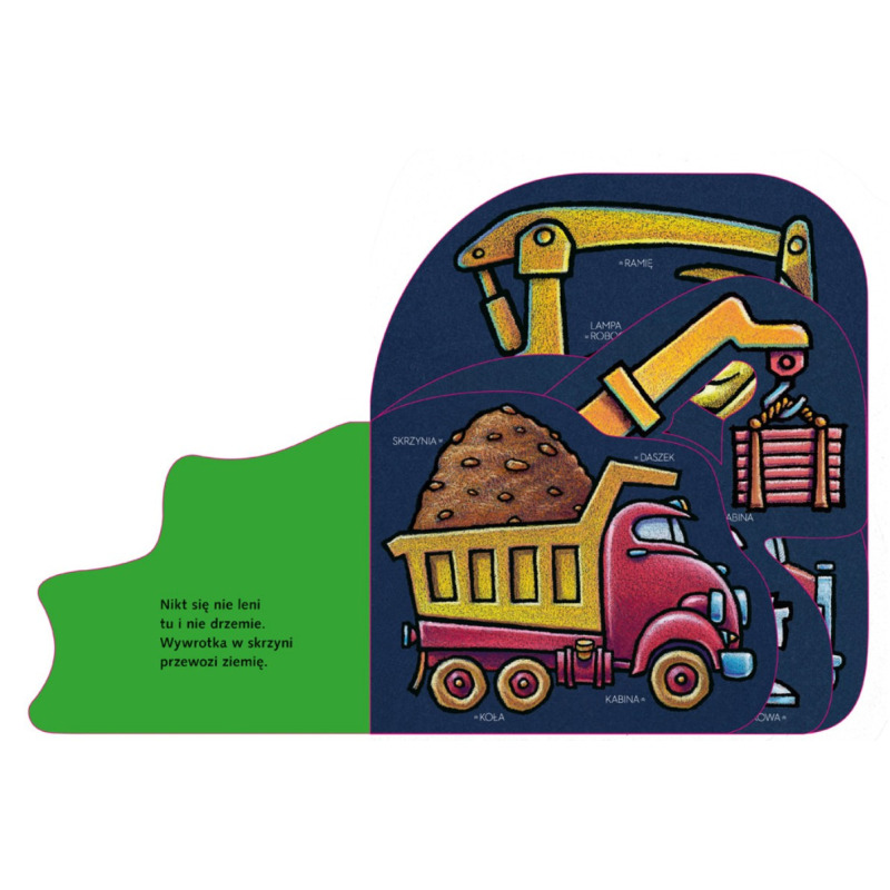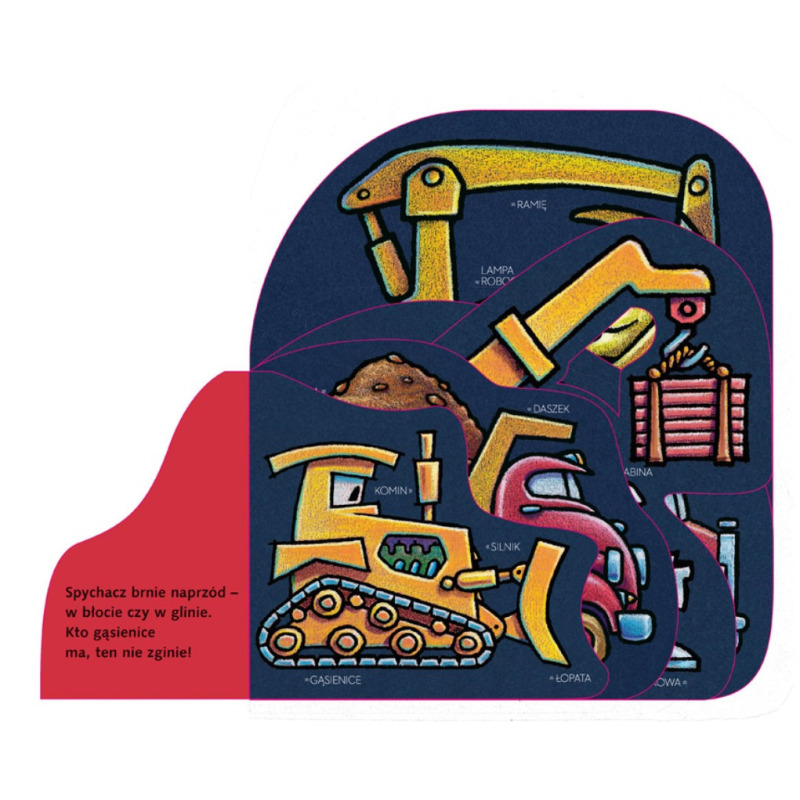 Kartonowa książeczka na dobranoc, którą pokochały dzieci na całym świecie! Kto jeździ na kołach, a kto na gąsienicach? Kto zgarnia ziemię łyżką, a kto łopatą? Sprawdź, co robi piątka przyjaciół: spychacz, wywrotka, dźwig, betoniarka i koparka. Odkryj też najważniejsze części maszyn budowlanych. Każda karta tej książki ma inny, zaskakujący kształt!