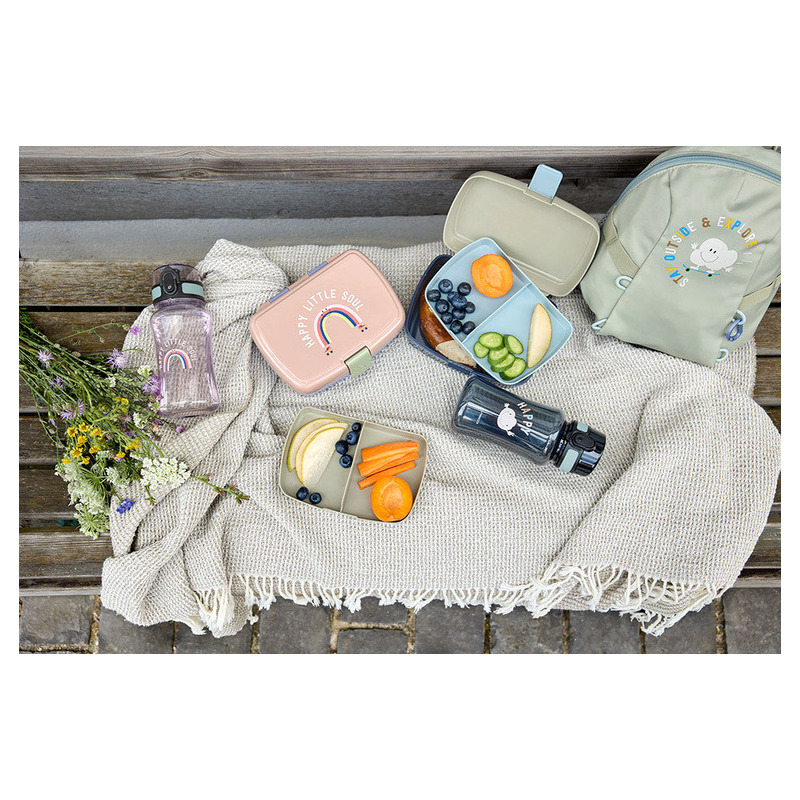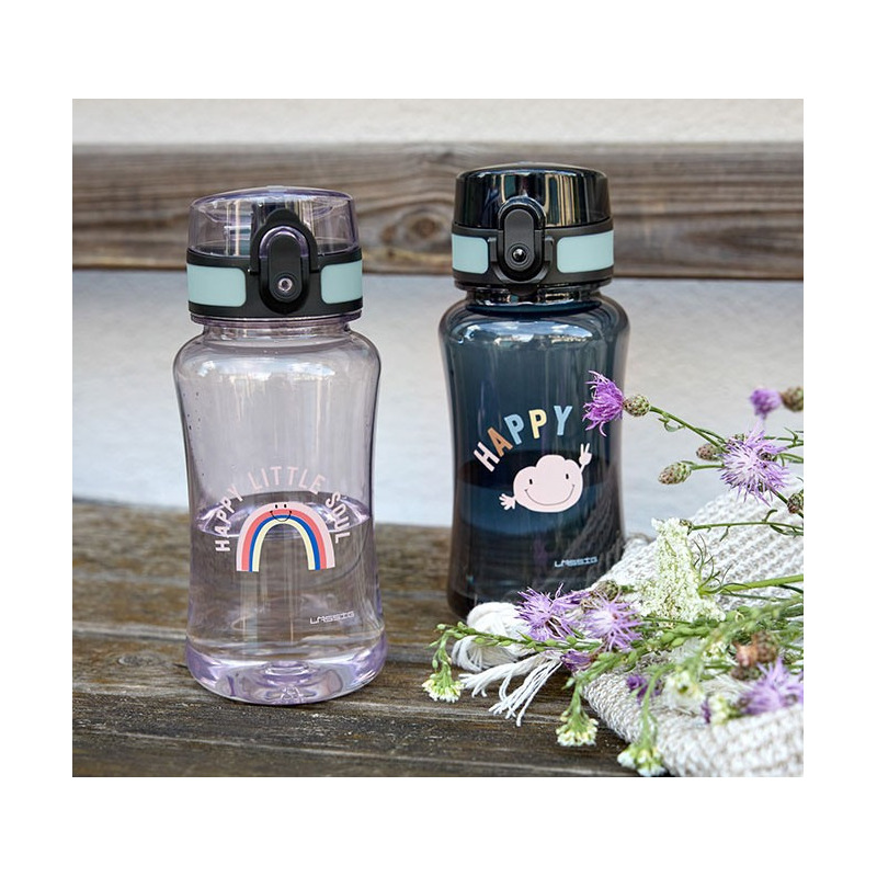 Na bidonie znajduje się napis HAPPY LITTLE SOUL i zabawna grafika z tęczą.