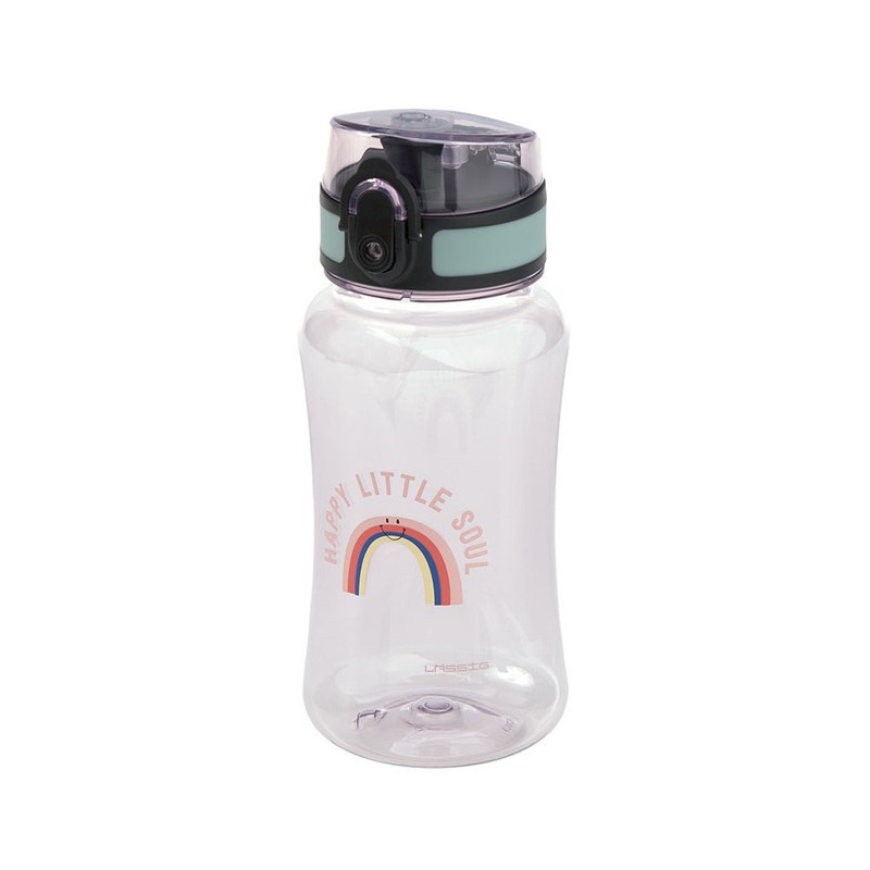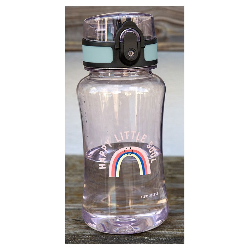 Na bidonie znajduje się napis HAPPY LITTLE SOUL i zabawna grafika z tęczą.