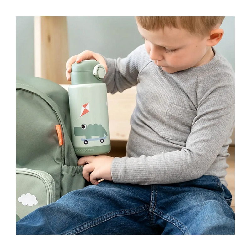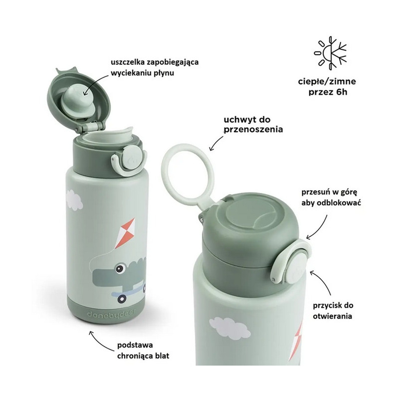 Butelka termiczna ze stali nierdzewnej stworzona, tak aby utrzymać temperaturę płynu aż do 6 godzin. Przemyślane detale ułatwiają maluchom samodzielne użytkowanie: zamykana na przycisk pokrywka zaprojektowana dla małych paluszków, bezpieczna silikonowa uszczelka zapobiegająca rozlaniu w plecakach i praktyczny uchwyt do noszenia w podróży. Butelka termiczna utrzymuje napoje dokładnie