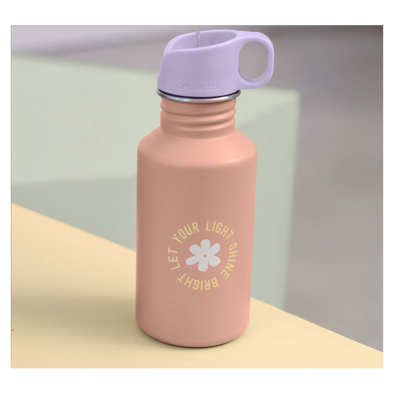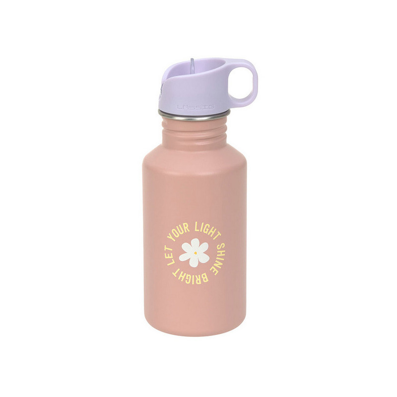 Bidon ma jasny pudrowo-różowy kolor z grafiką białego kwiatka, napisem: LET YOUR LIGHT SHINE BRIGHT oraz liliową pokrywkę.