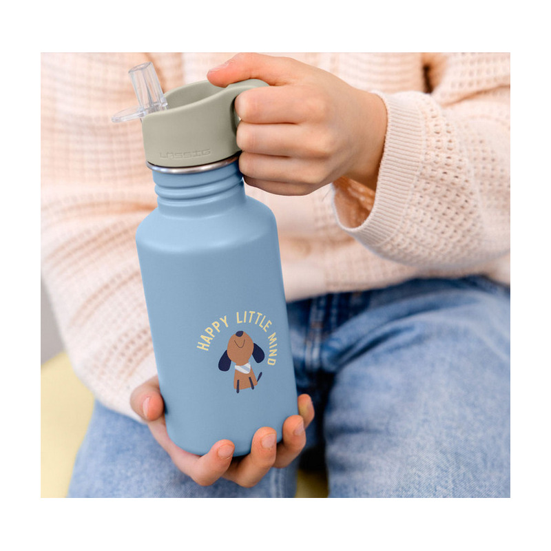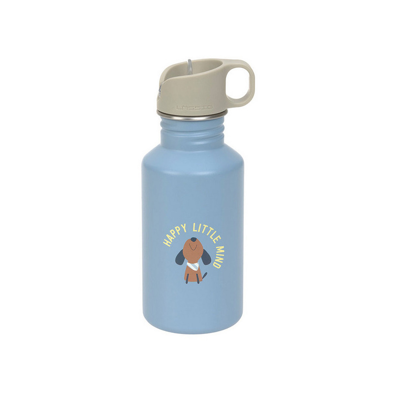 Bidon ma jasny niebieski kolor z grafiką radosnego brązowego pieska, napisem: HAPPY LITTLE MIND oraz beżową pokrywkę.