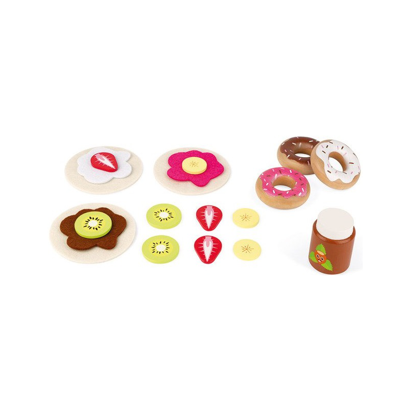 - 3 drewniane donuty z różnymi polewami, 3 drewniane gofry, 3 drewniane naleśniki,