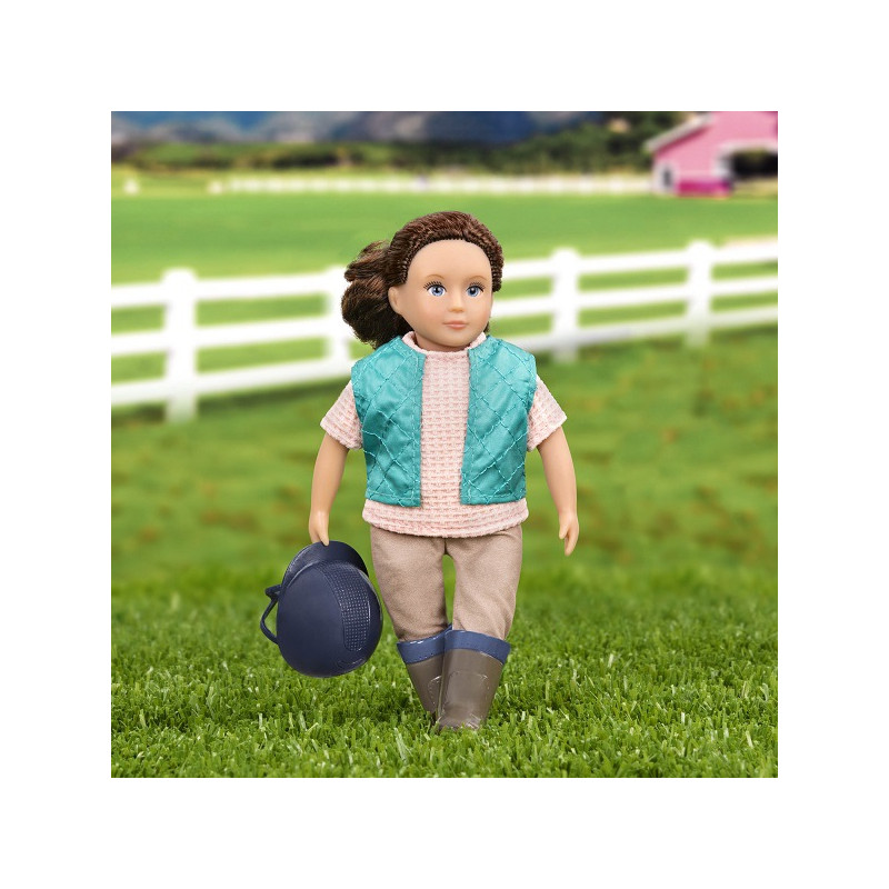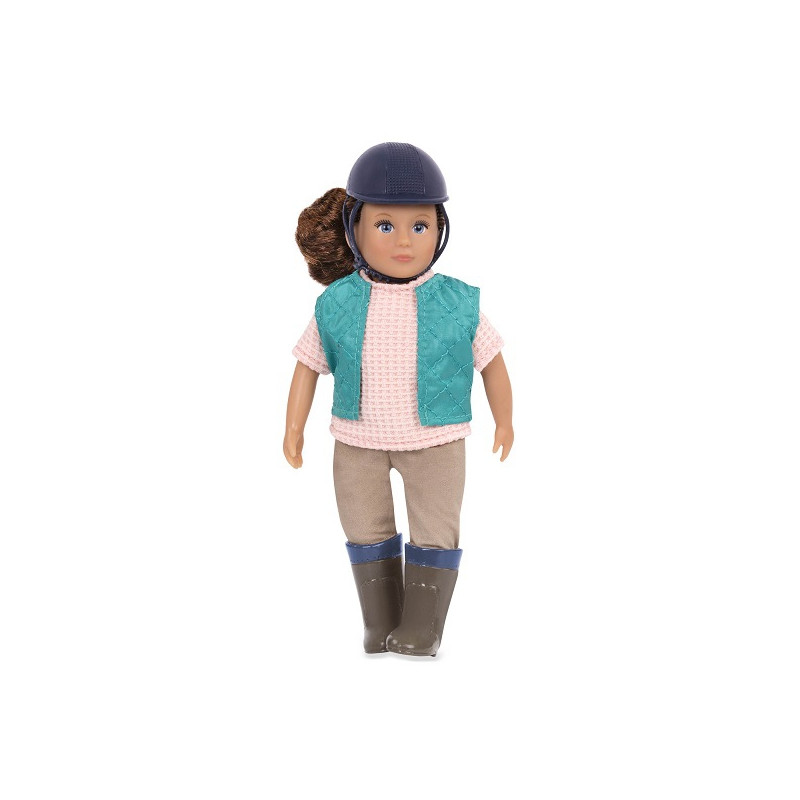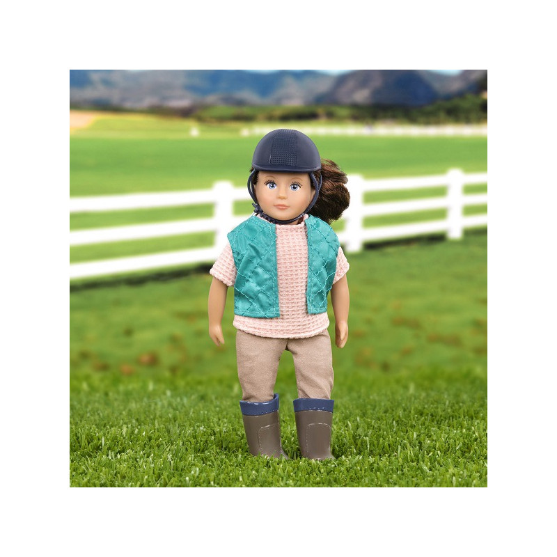 lalkę ubraną w bluzeczkę na krótki rękaw, turkusową kamizelkę, beżowe spodnie i buty jeździeckie.