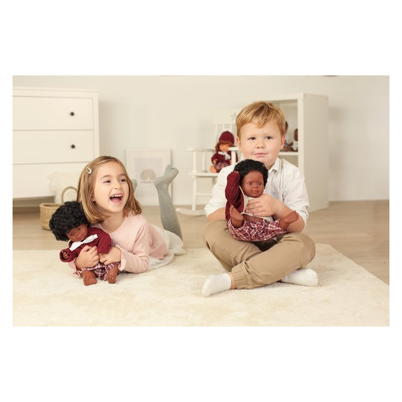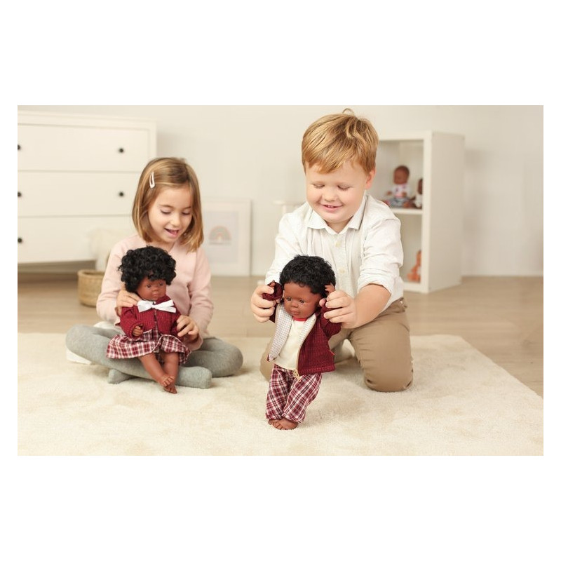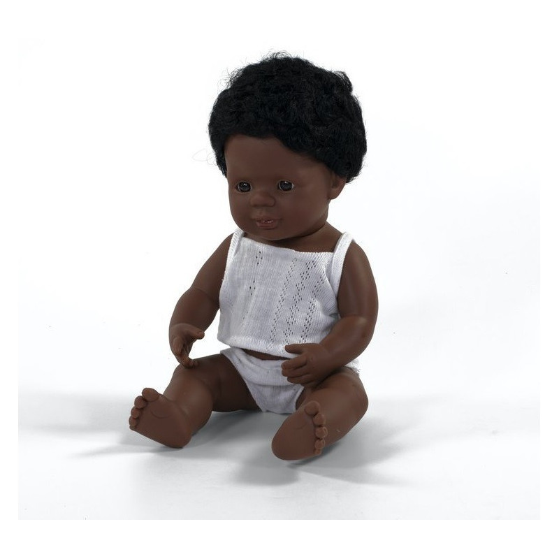 Lalka chłopiec Afroamerykańczyk posiada ciemną skórę, brązowe mocno kręcone włosy i brązowe oczy.