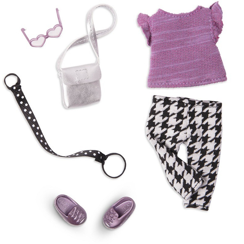 lalkę ubraną we wzorzyste spodnie, fioletową bluzkę