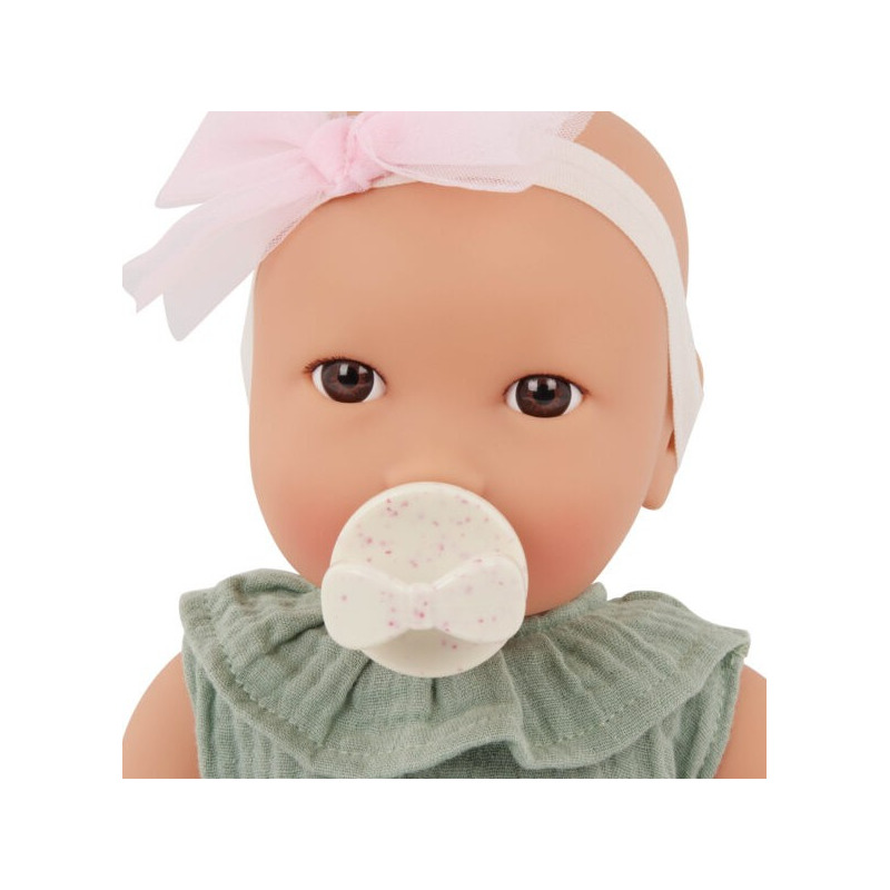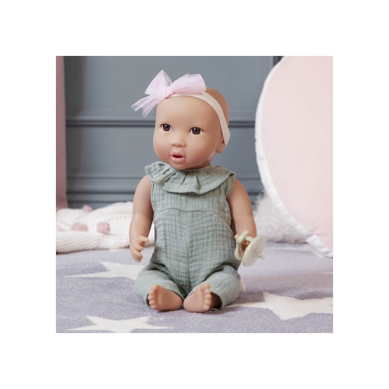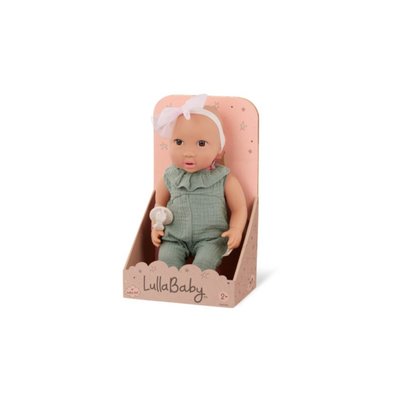 NIEMOWLĘ lalka ze smoczkiem, w zielonym muślinowym ubranku i opasce 35 cm LullaBaby 2+