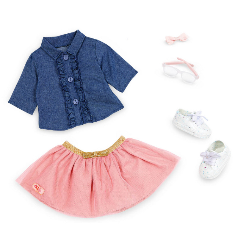Lalka ubrana jest w elegancką jeansowa koszulę i dwuwarstwową spódniczkę.