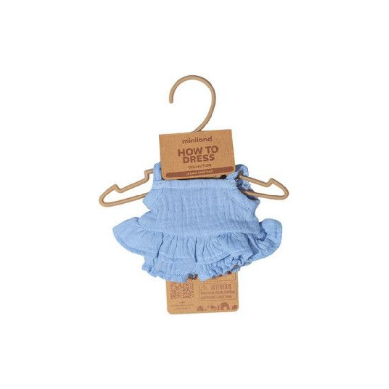 Ubierz swoją lalkę Miniland w uroczy zestaw, idealny na cieplejsze dni. Mini garderobę w rozmiarze 21 cm uzupełni uroczy strój składający się z muślinowej bluzeczki na ramiączkach w kolorze niebieskim oraz spodenek z falbanką w tym samym odcieniu.