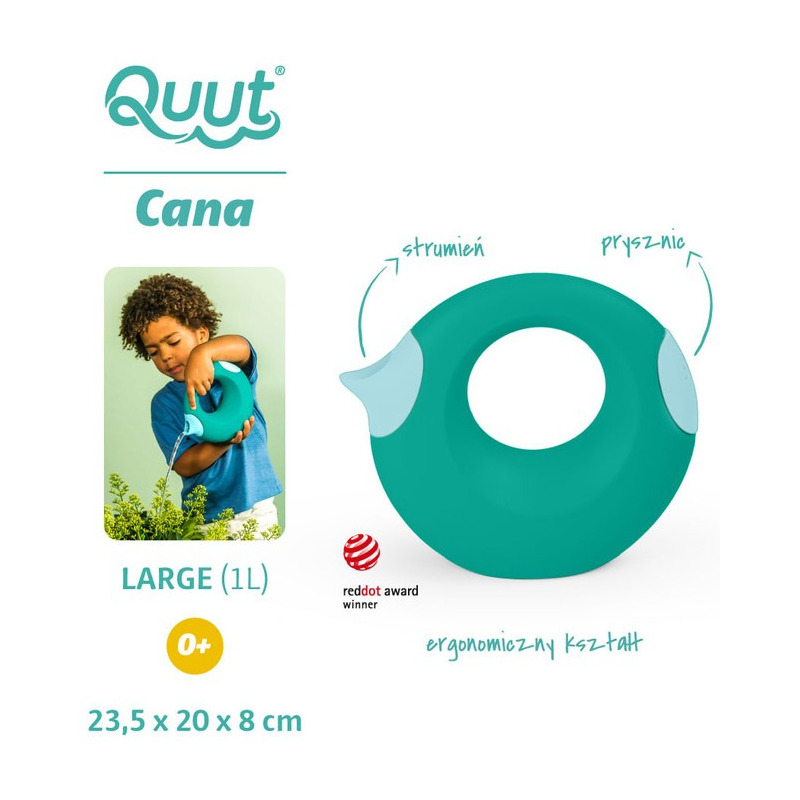 Duża konewka Cana marki Quut przyciąga wzrok niebanalnym designem i oryginalną kolorystyką. Ma pojemność 1l, jest poręczna, lekka i łatwa do utrzymania. To sprytne rozwiązanie, np. do przenoszenia wody czy podlewania roślin. Ma zaokrąglony kształt, gumowe wykończenie z dziubkiem po jednej stronie i drobne sitko do robienia prysznica po drugiej. Jest stabilna i wygodna w użytkowaniu. Sprawdza się w domu, ogrodzie, podczas zabaw nad wodą oraz w wannie.