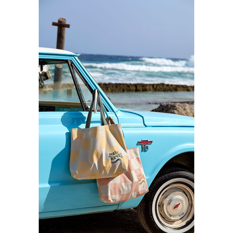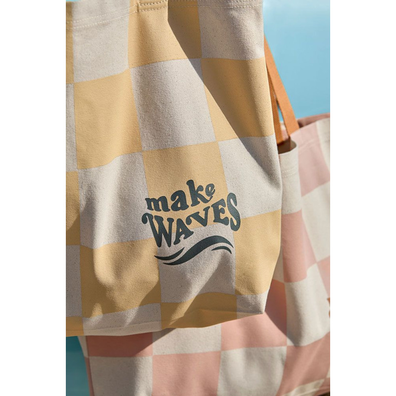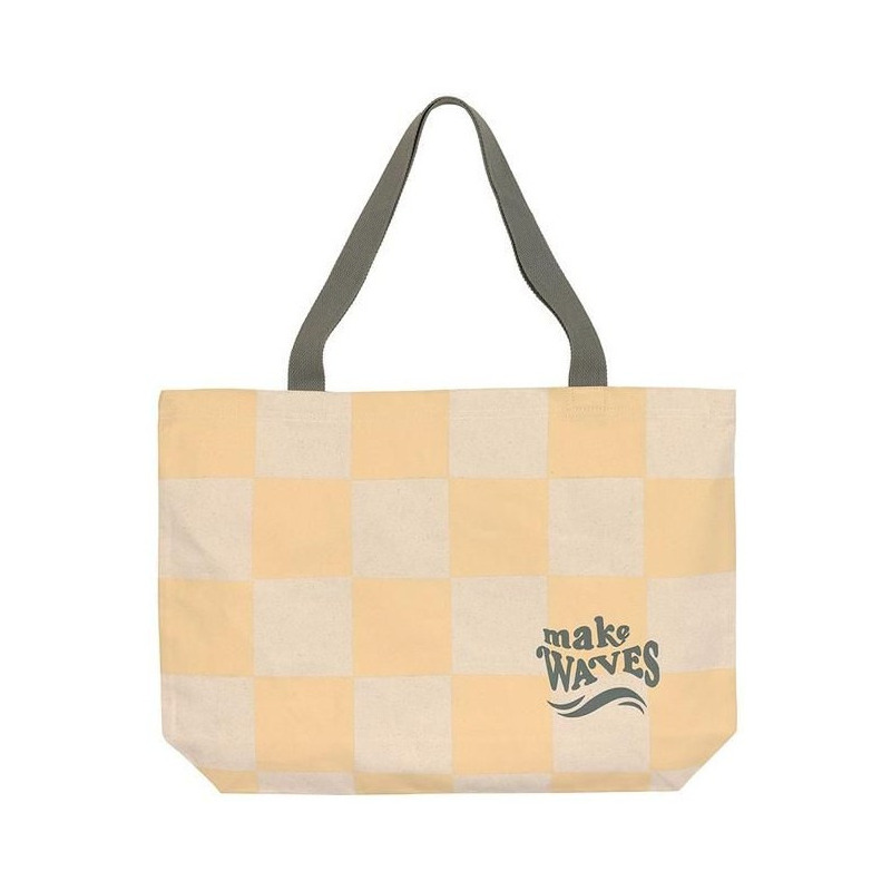 Design: kolor écru/wanilia w kratę; dodatki: oliwkowe rączki i napis „make waves”