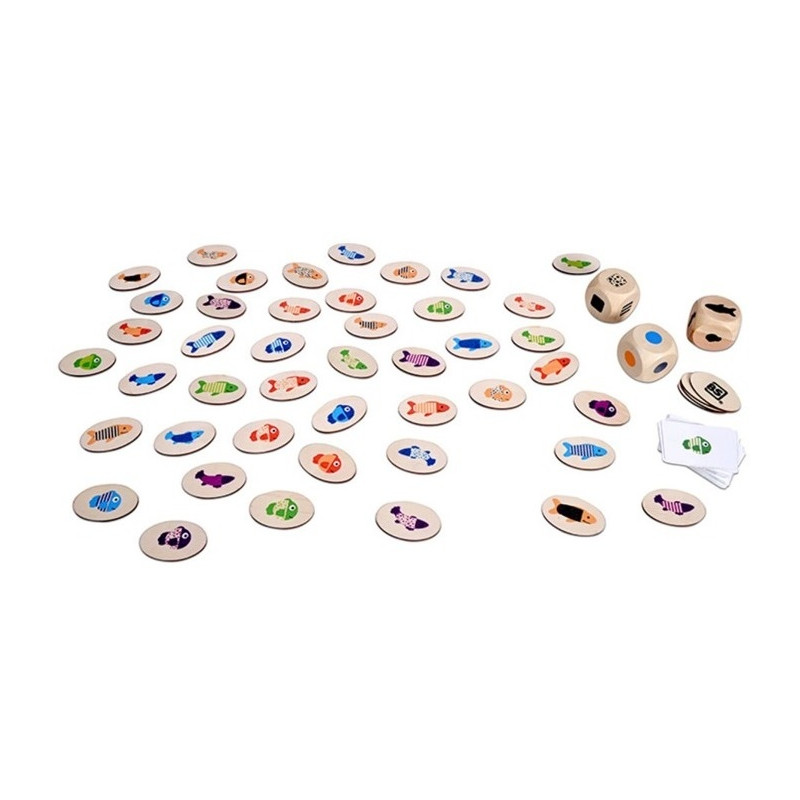 56 drewnianych rybek, 3 drewniane kostki oraz 56 kart z rysunkami rybek