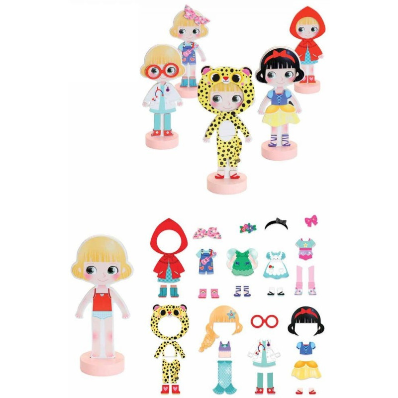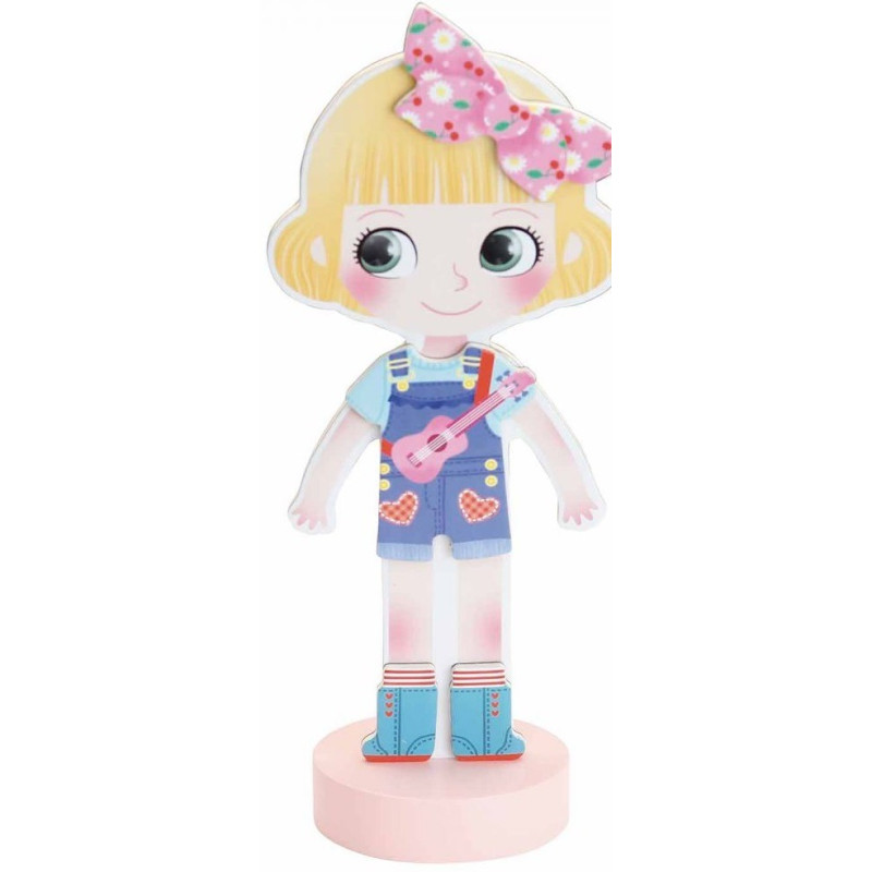 - drewnianą, stojącą laleczkę Mię i 36 magnesów w kształcie elementów garderoby i fryzur