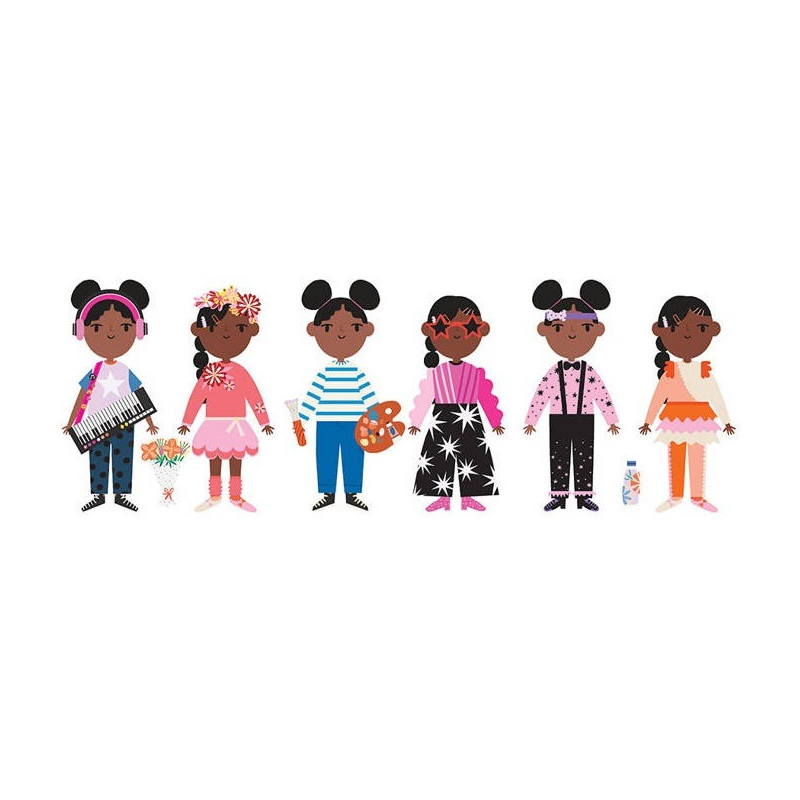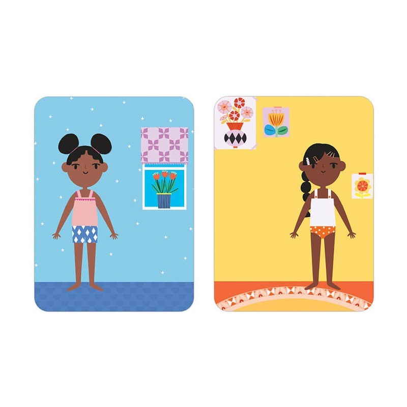 Dwie postaci – dziewczynki – można ubierać w wybrane stroje i wyposażać zgodnie z tym, co podpowie wyobraźnia