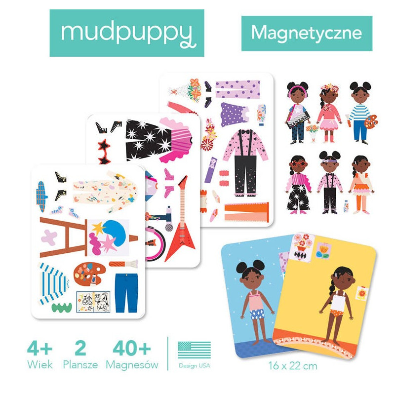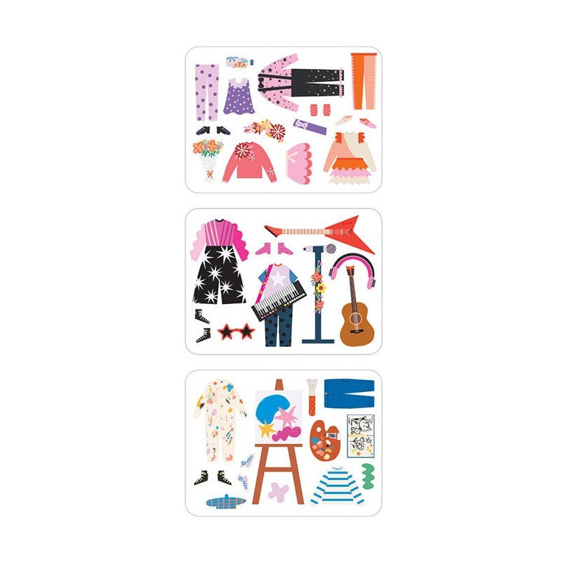 W zestawie znajduje się ponad 40 magnesów z elementami ubioru i innymi dodatkami (instrumentami, farbami itp.), które to umożliwią.