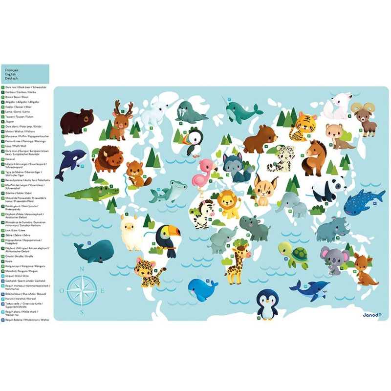 Do układanki dołączona jest ulotka z nazwami wszystkich gatunków zwierząt na planszy w języku francuskim, angielskim i niemieckim.