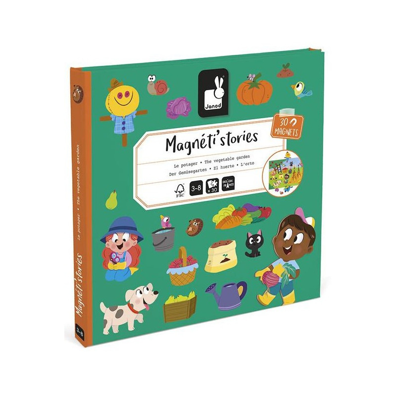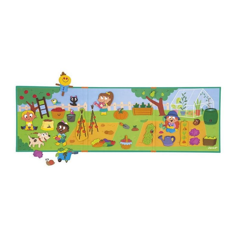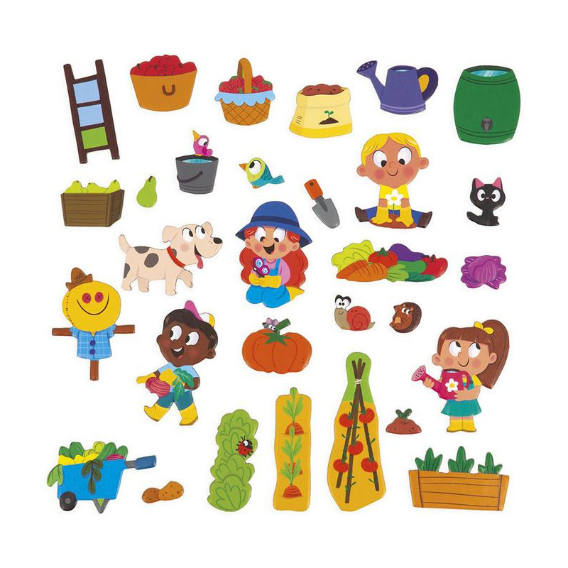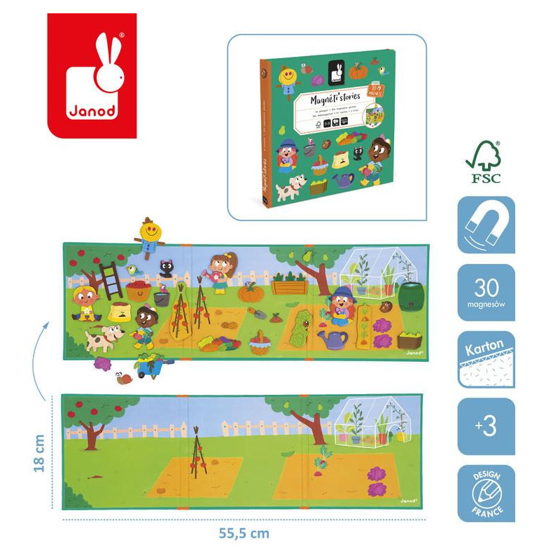 Magnetyczne historie W ogródku z linii Magneti'stories zawiera 30 magnesów – sadzonek, warzyw, zwierząt, małych ogrodników i innych elementów sielskiego krajobrazu, które stanowią części składowe do stworzenia oryginalnej ilustracji na rozkładanej potrójnej planszy.