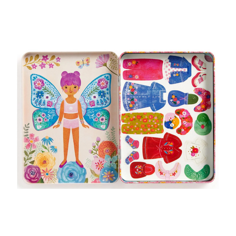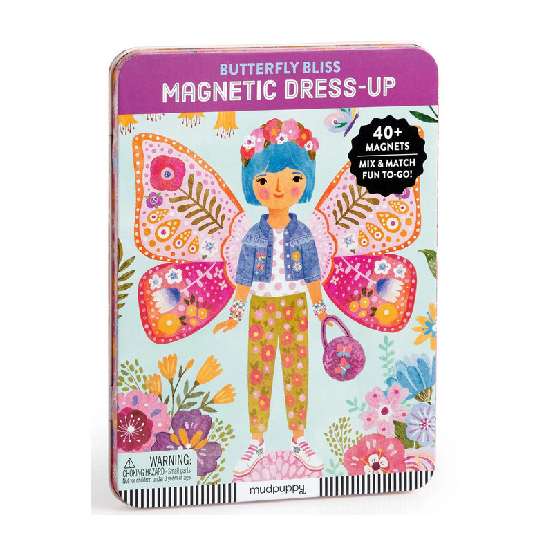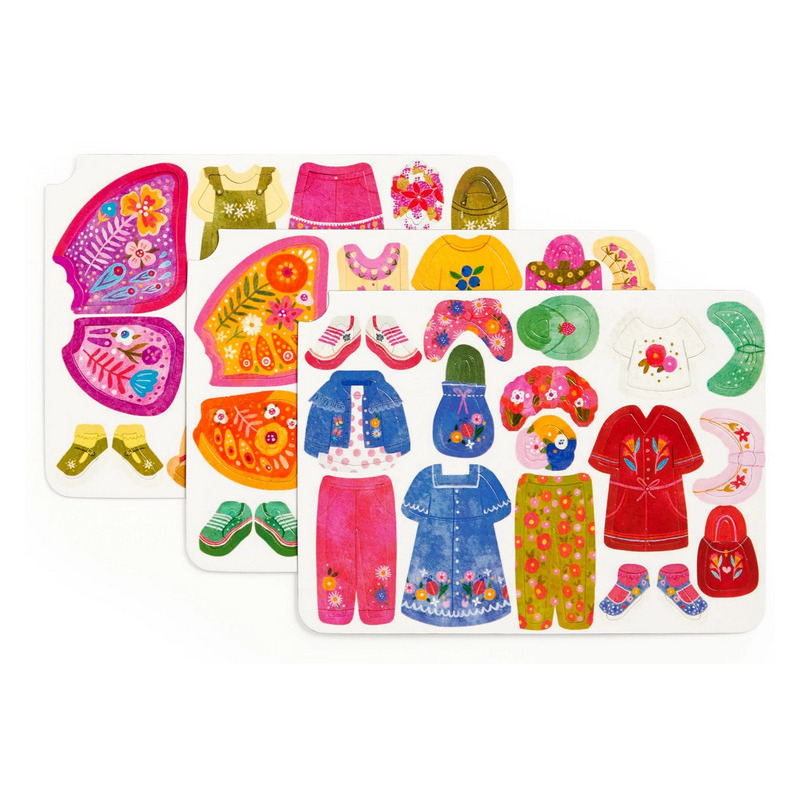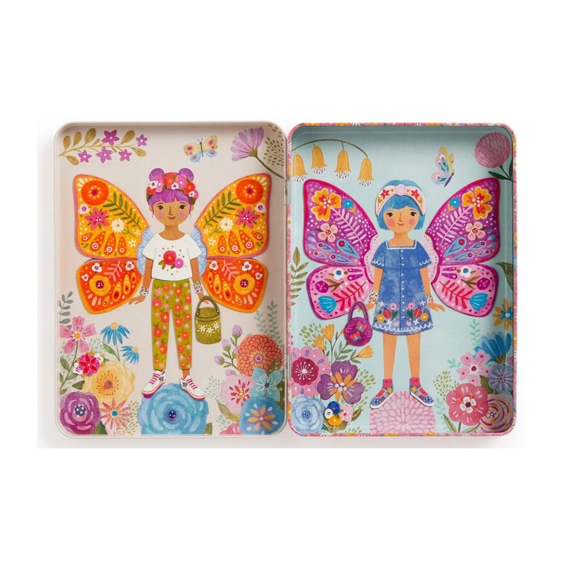 Zestaw magnesów do tworzenia postaci Szczęście motyli marki Mudpuppy to wyjątkowo kreatywna zabawka dla dzieci od 4. roku życia. Na dwóch magnetycznych planszach znajdują się postacie dziewczynek z bajecznie kolorowymi skrzydłami motyli. Można na nich układać ponad 40 magnesów — elementów garderoby i dodatków w różnych wzorach i kolorach — tworząc piękne i modne stylizacje.