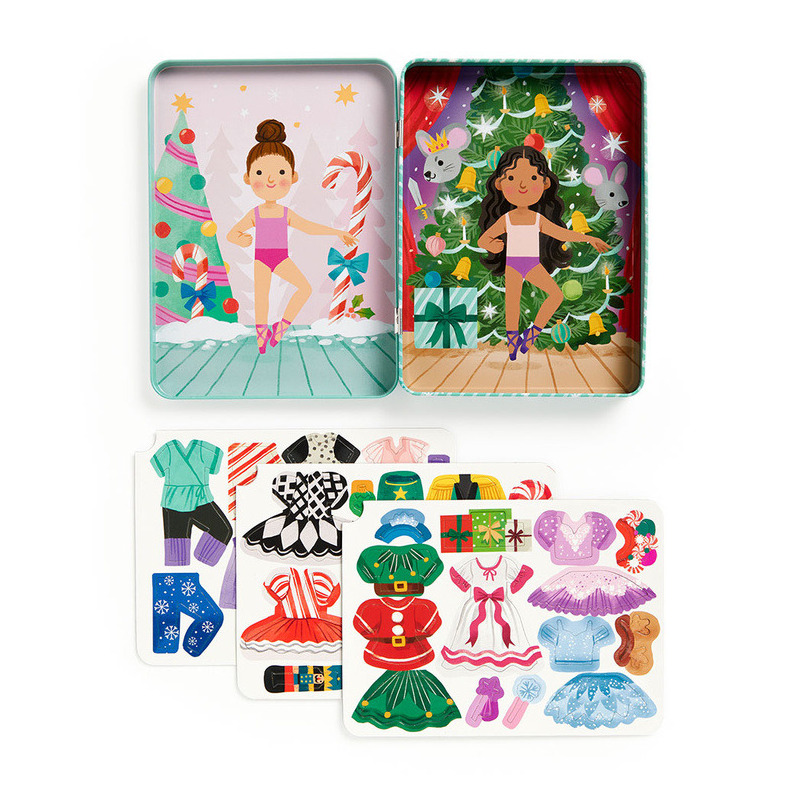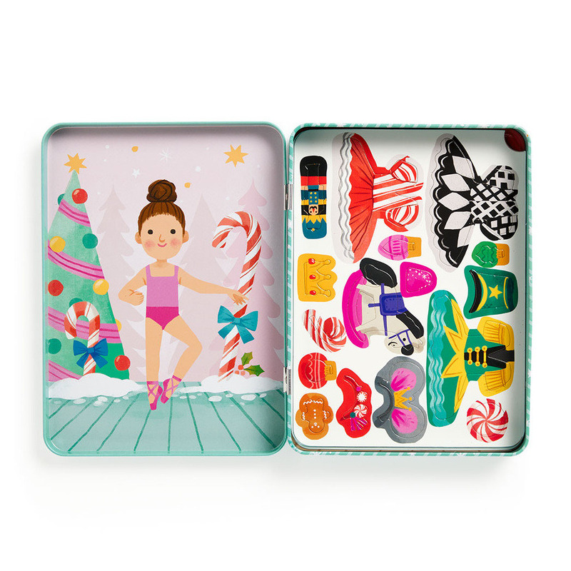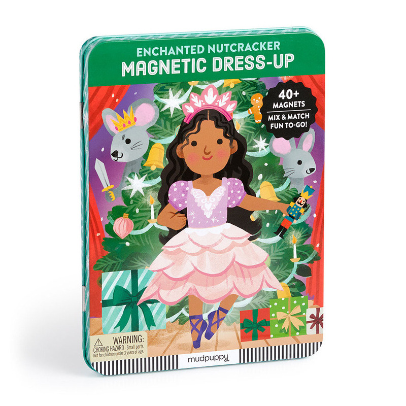 Magnetyczna układanka z zestawem magnesów Zaczarowany dziadek do orzechów amerykańskiej marki MUDPUPPY to wyjątkowo kreatywna zabawka dla dzieci od 4. roku życia. Zabawka ma format metalowego zamykanego pudełka. Na dwóch magnetycznych planszach wewnątrz pudełka znajdują się postacie baletnic na tle pięknej świątecznej scenerii. Można na nich umieszczać magnesy - elementy garderoby oraz scenografii, w tym takie z motywem dziadka do orzechów (w zestawie znajdują się 3 arkusze z ponad 40 magnesami).