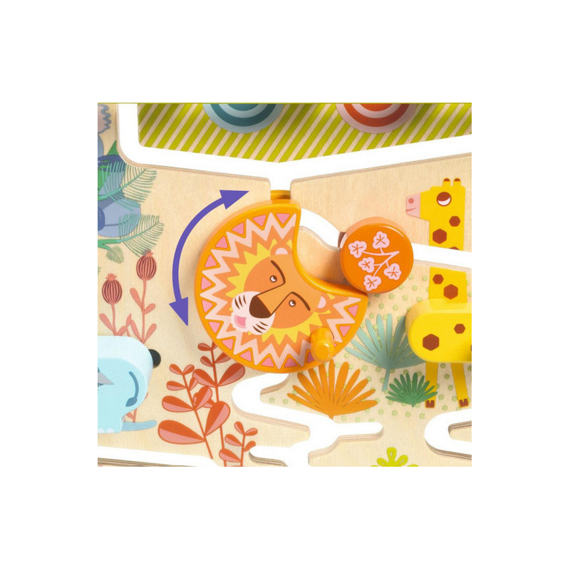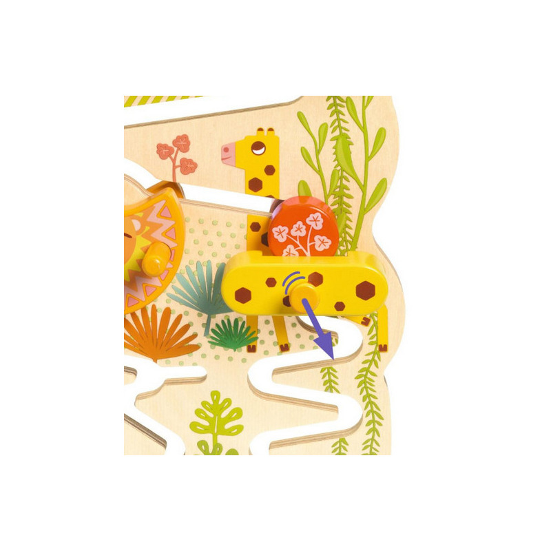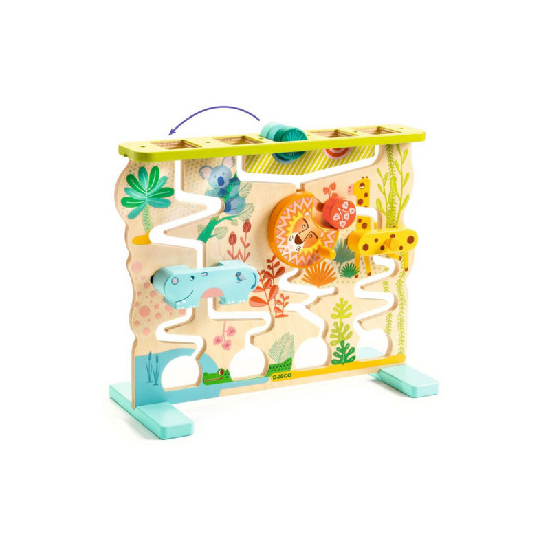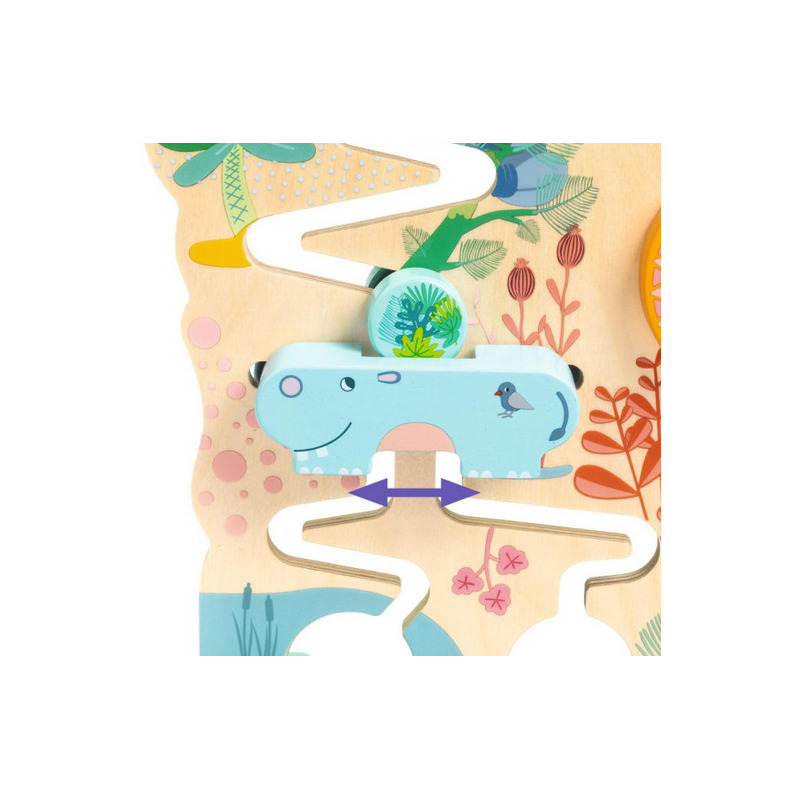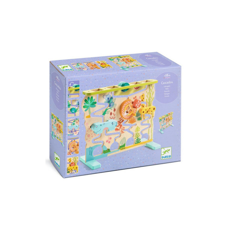 Drewniana zabawka wczesnorozwojowa z przesuwanymi elementami dla dzieci od 18. miesiąca życia. Maluszki przesuwają małe, drewniane dyski znajdujące się u góry, które następnie spadają w dół do zwierzątek, które je zatrzymują. Aby je uwolnić i pozwolić im spaść na dół "wodospadu", dzieci muszą obrócić grzywę lwa, podnieść żyrafę lub odsunąć hipopotama na bok. Dyski przesuwają się powoli, co daje dziecku czas na obserwację.