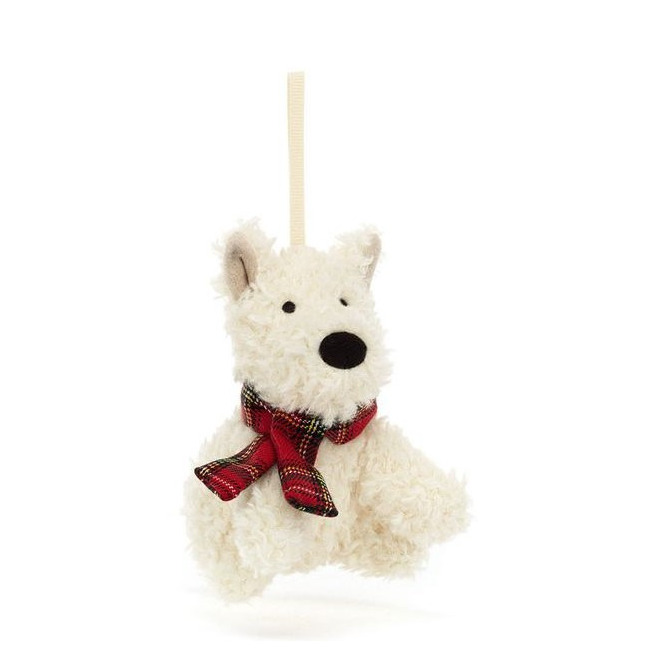 Piesek Terrier zawieszka to mięciutki pluszak o kremowym futerku, błyszczących oczkach i lukrecjowym nosku. Jego brzuszek i łapki są wyjątkowo przyjemne w dotyku, a szalik w szkocką kratę dodaje mu świątecznego uroku. Idealny jako drobny upominek lub ozdoba na choinkę.